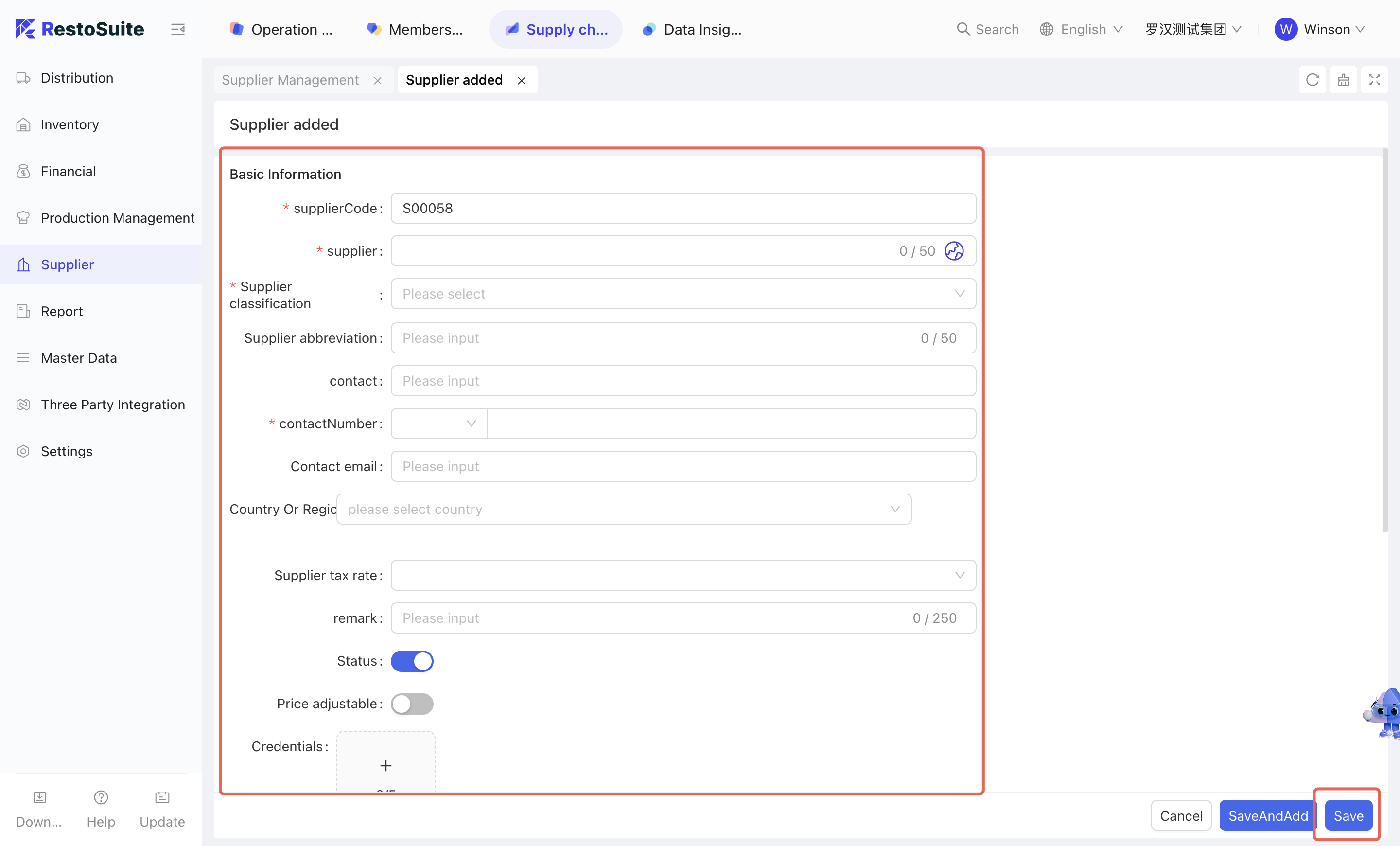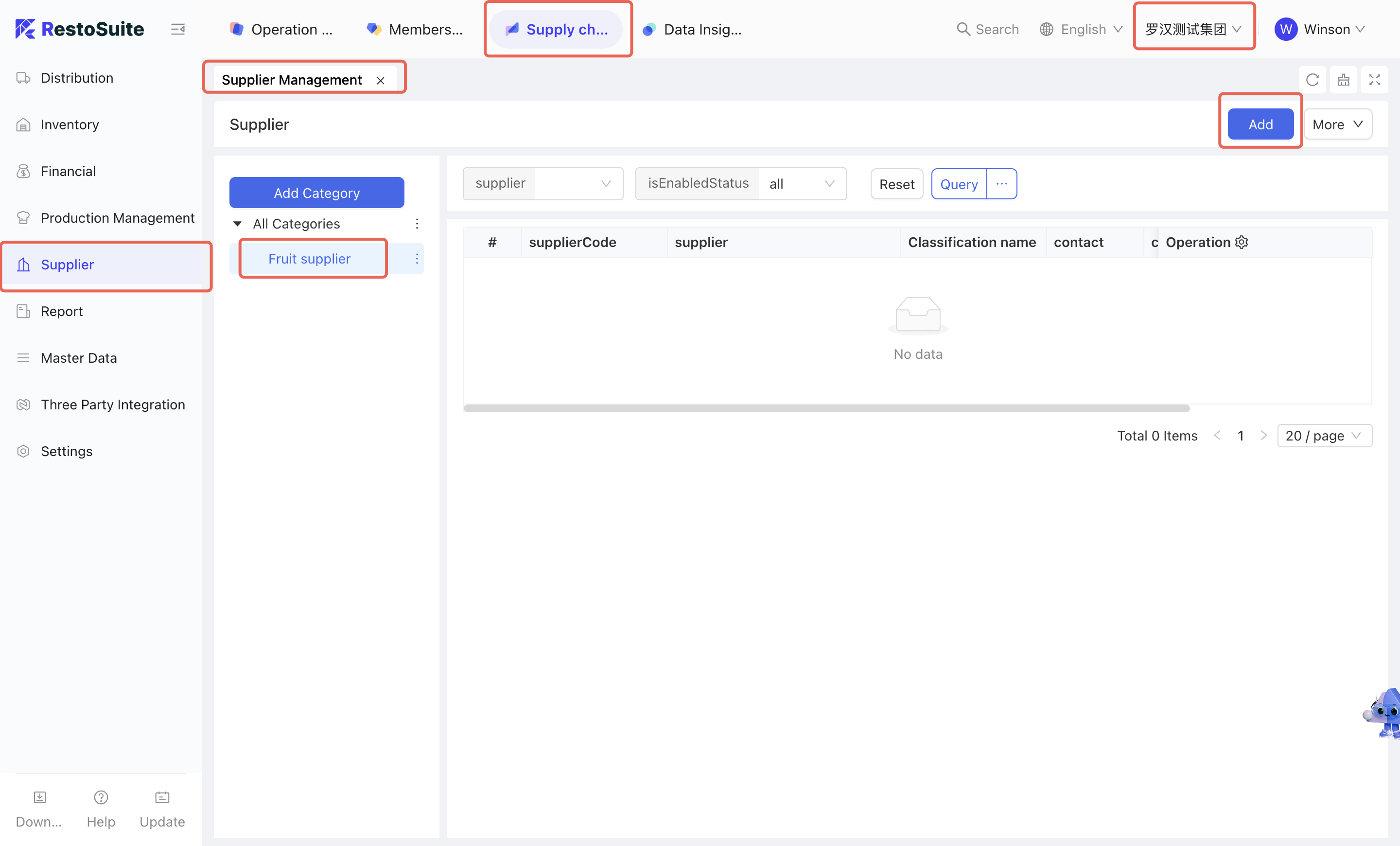 The Supplier Management module is used for the addition and maintenance of supplier classification and specific supplier information.