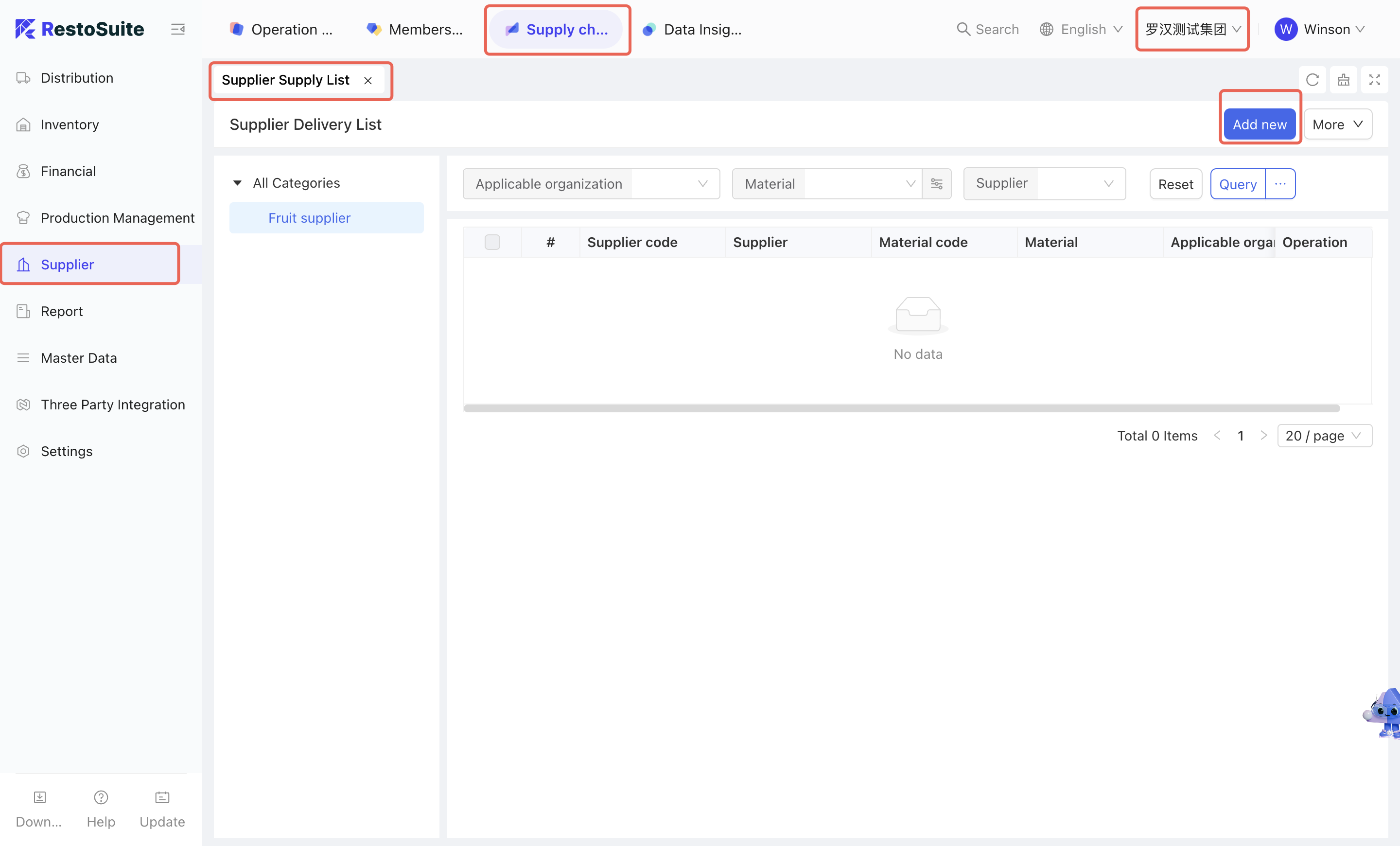 In actual procurement and warehousing operations, some materials are supplied by specific suppliers. Therefore, the Supplier Material Supply List can strongly bind materials, suppliers and organizations together. After this function is configured, its priority is higher than that of the distribution rules.