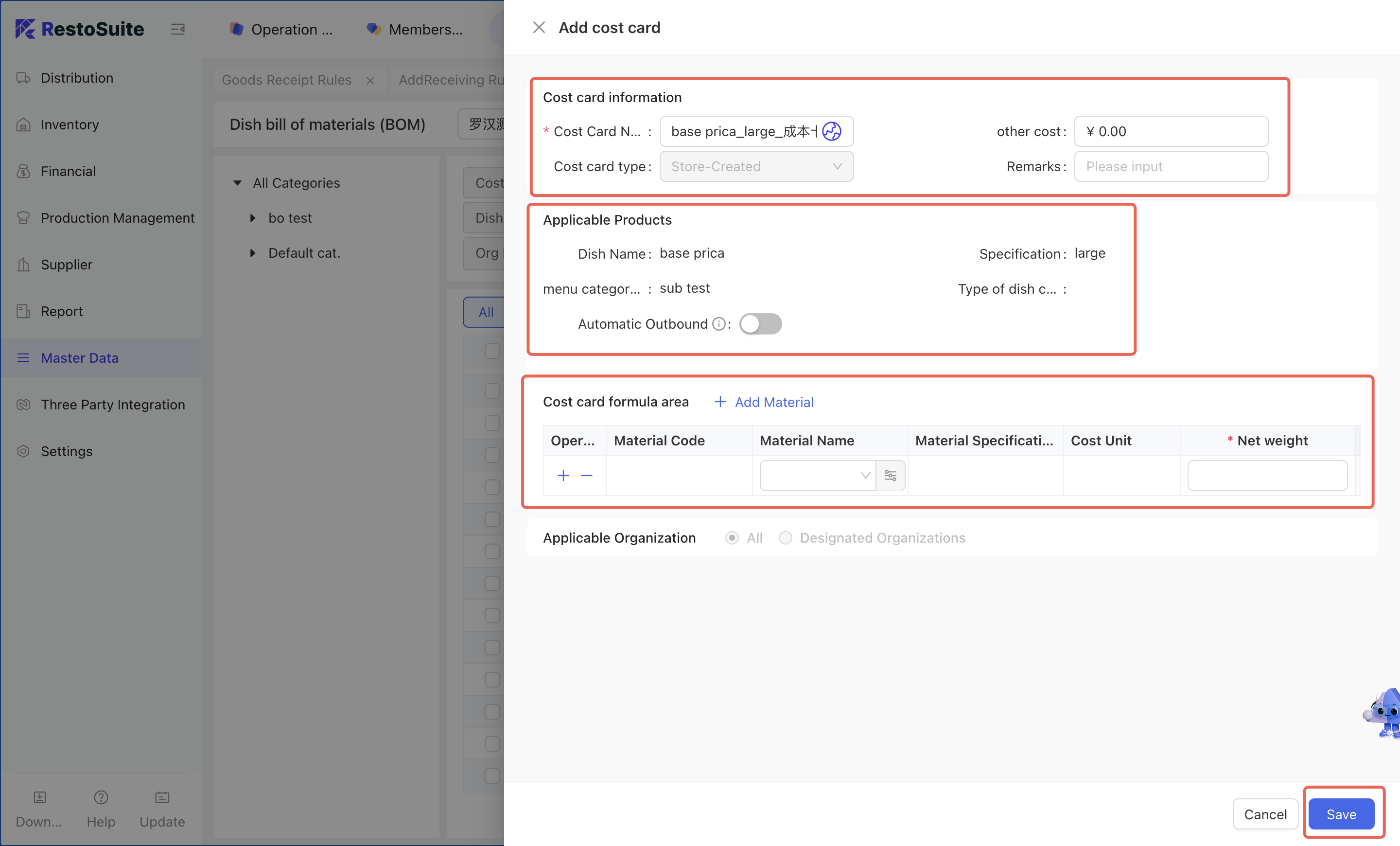 The Menu Item Cost Card node is used to set the materials required for dish preparation in each store. It supports the following functions: