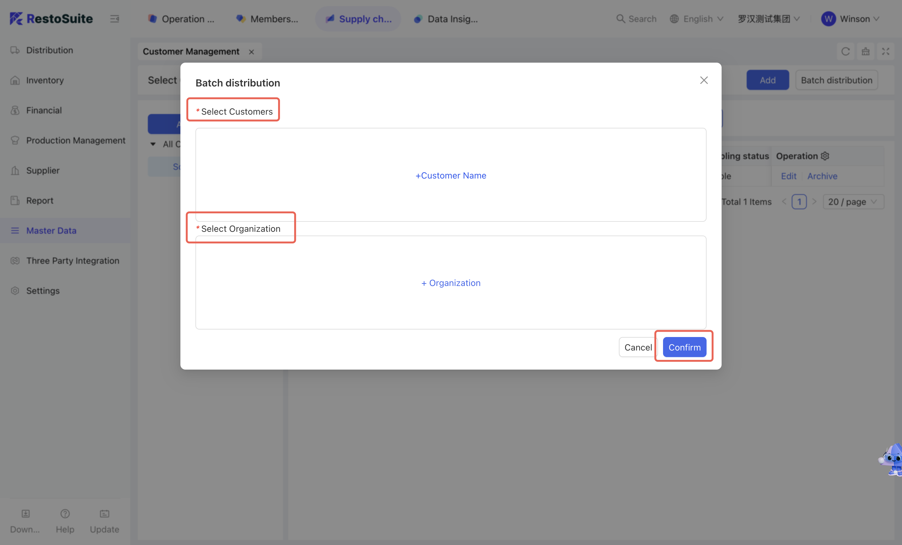 - Click [Batch Distribution] → Select the customers to be distributed → Select the applicable organizations → Click [Confirm].