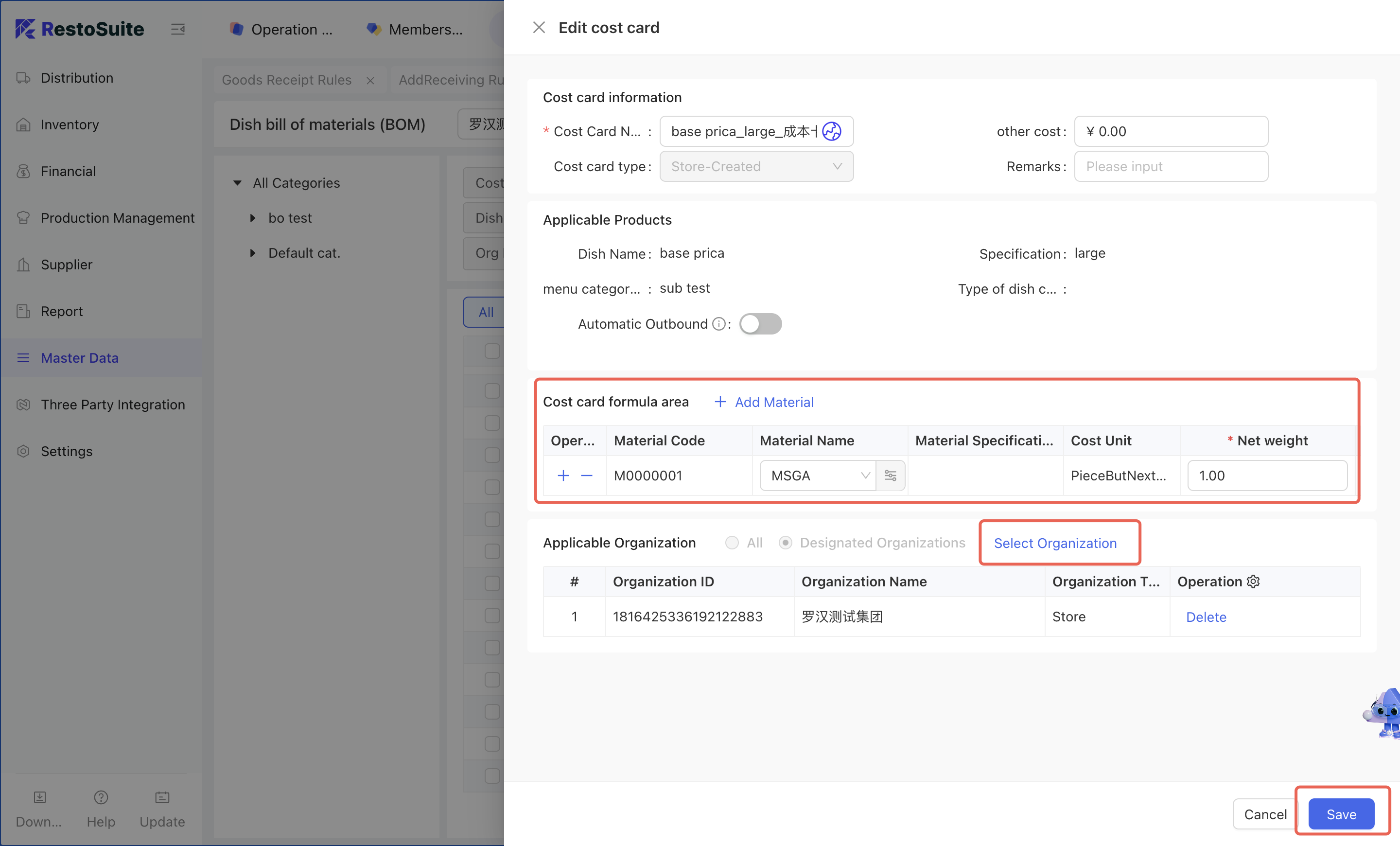 - Select the dish for which an exception cost card needs to be set → Click [Copy] → Click [Edit] on the copied Menu Item Cost Card → Set the details of the exception cost card → Select the applicable organization for the exception cost card → Click [Save].