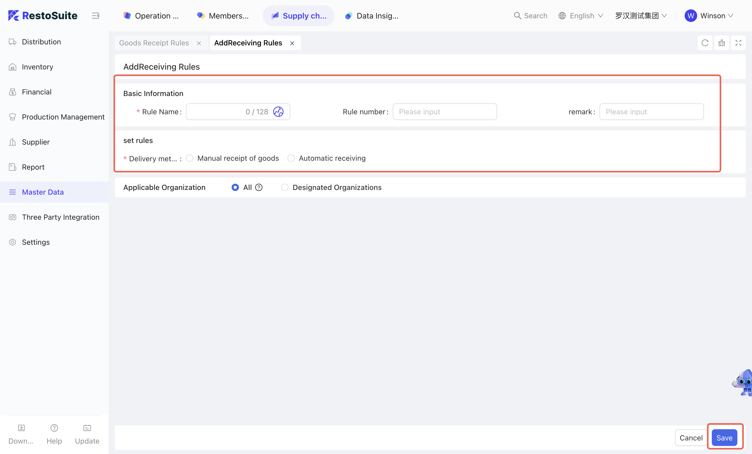 - On the [Add Receiving Rules] page, maintain the receiving rule name, set the receiving method, and select the applicable receipt type and organization → Click [Save].