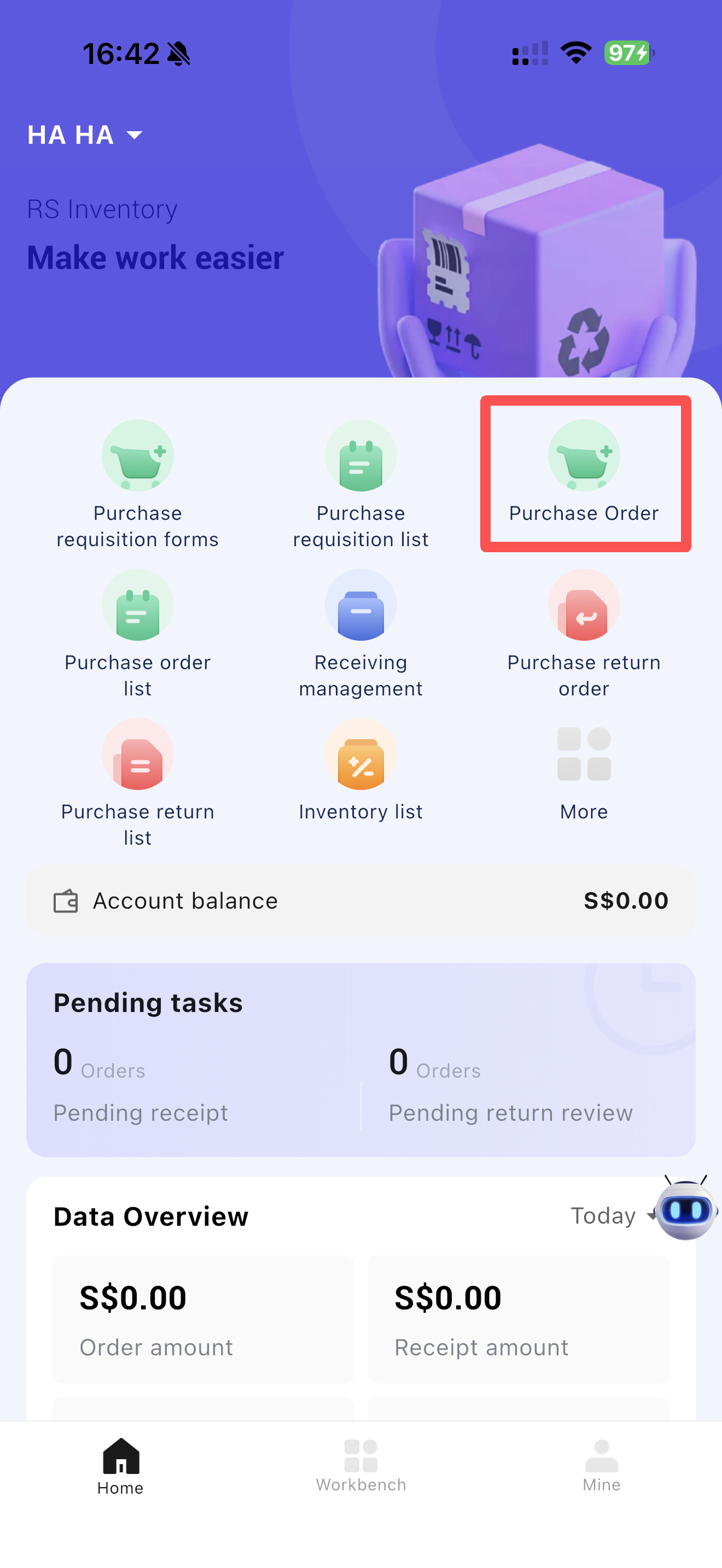 Click [Purchase Order] to create new orders via templates or manual entry.