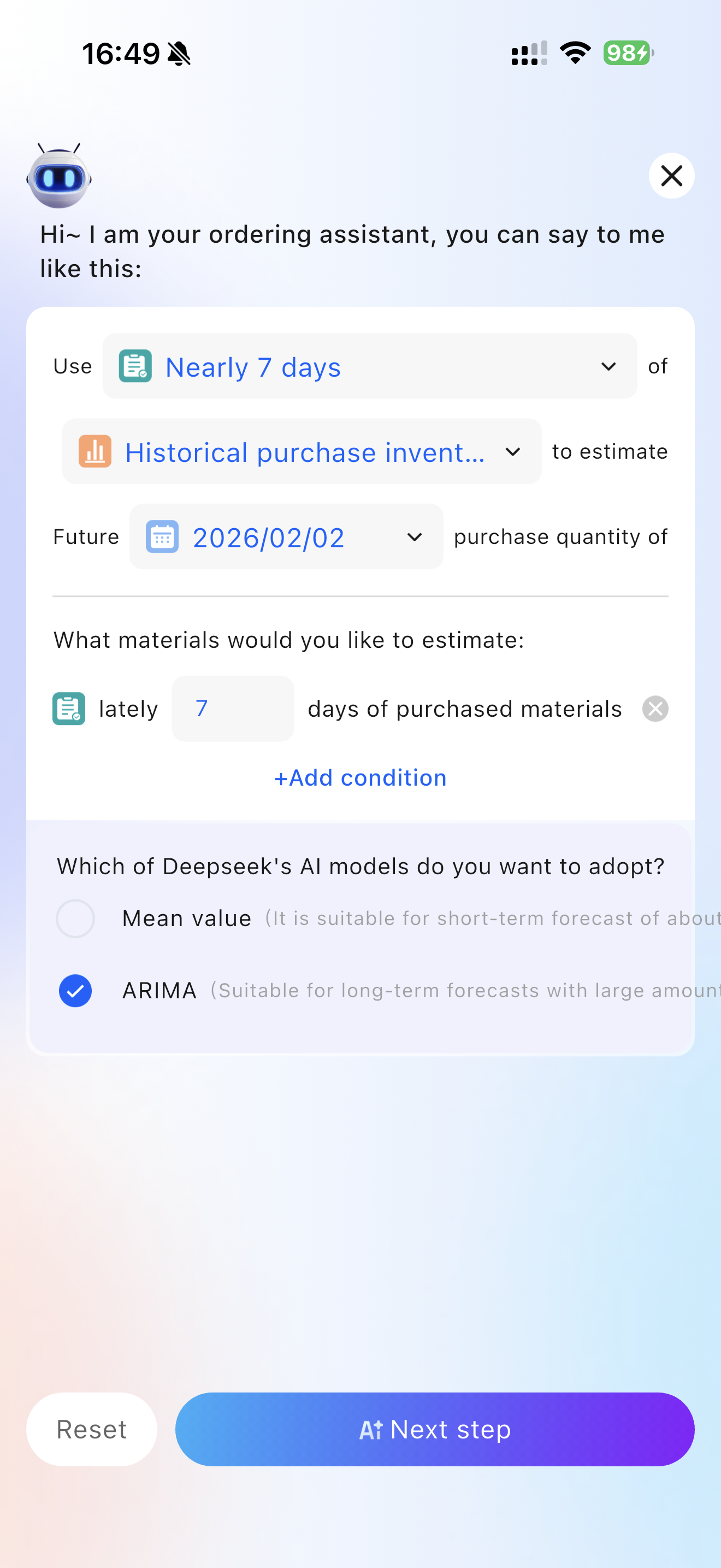 This function uses AI algorithms and current inventory levels to intelligently calculate recommended purchase quantities for future dates. It supports three data sources for estimation: historical purchase inbound volumes, raw material usage derived from historical dish sales, and turnover.