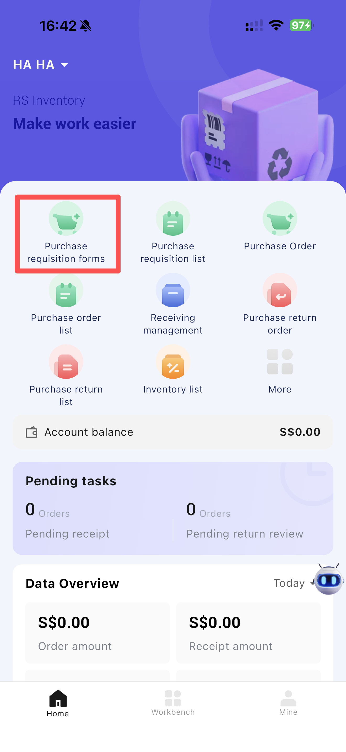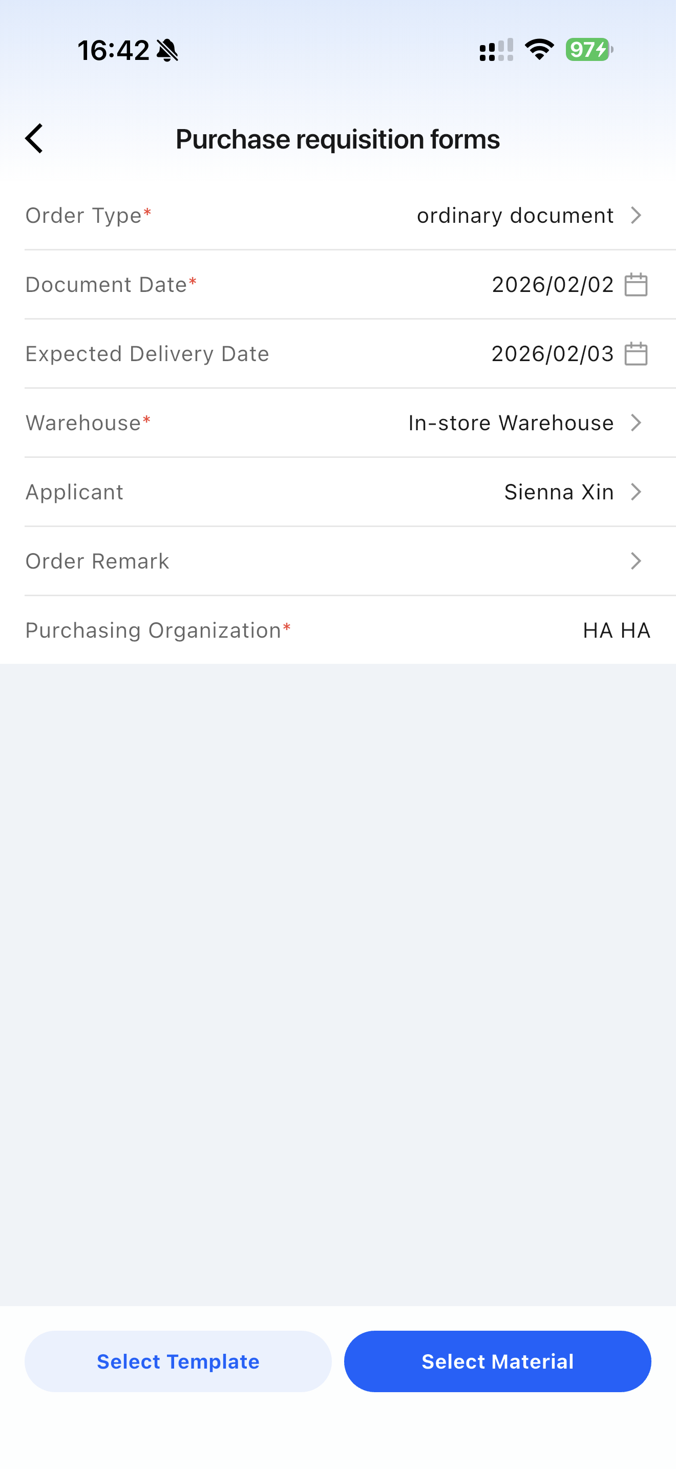 - Click [Purchase Requisition] to create new requisitions via templates or manual entry.