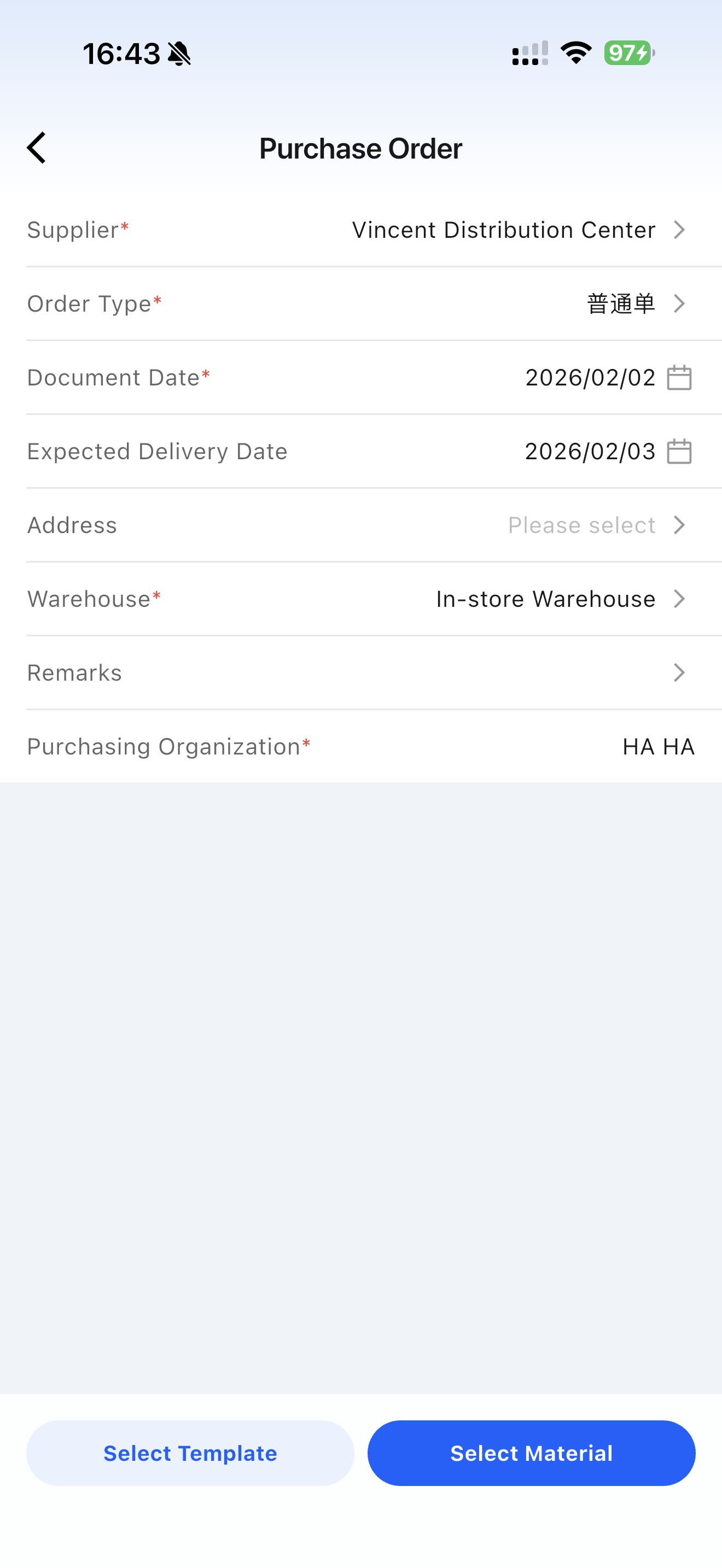 - Store staff: Submit orders specifying only materials and quantities (no supplier selection required); the central team processes all orders uniformly.