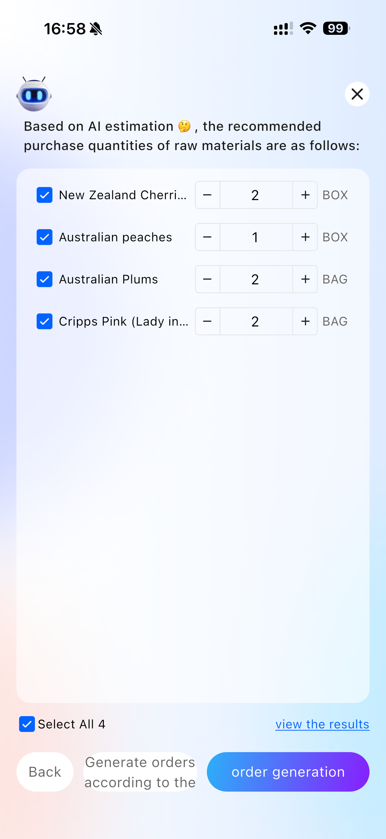 - On the Restosuite Inventory APP homepage, click [Robot] to access the intelligent estimation page.