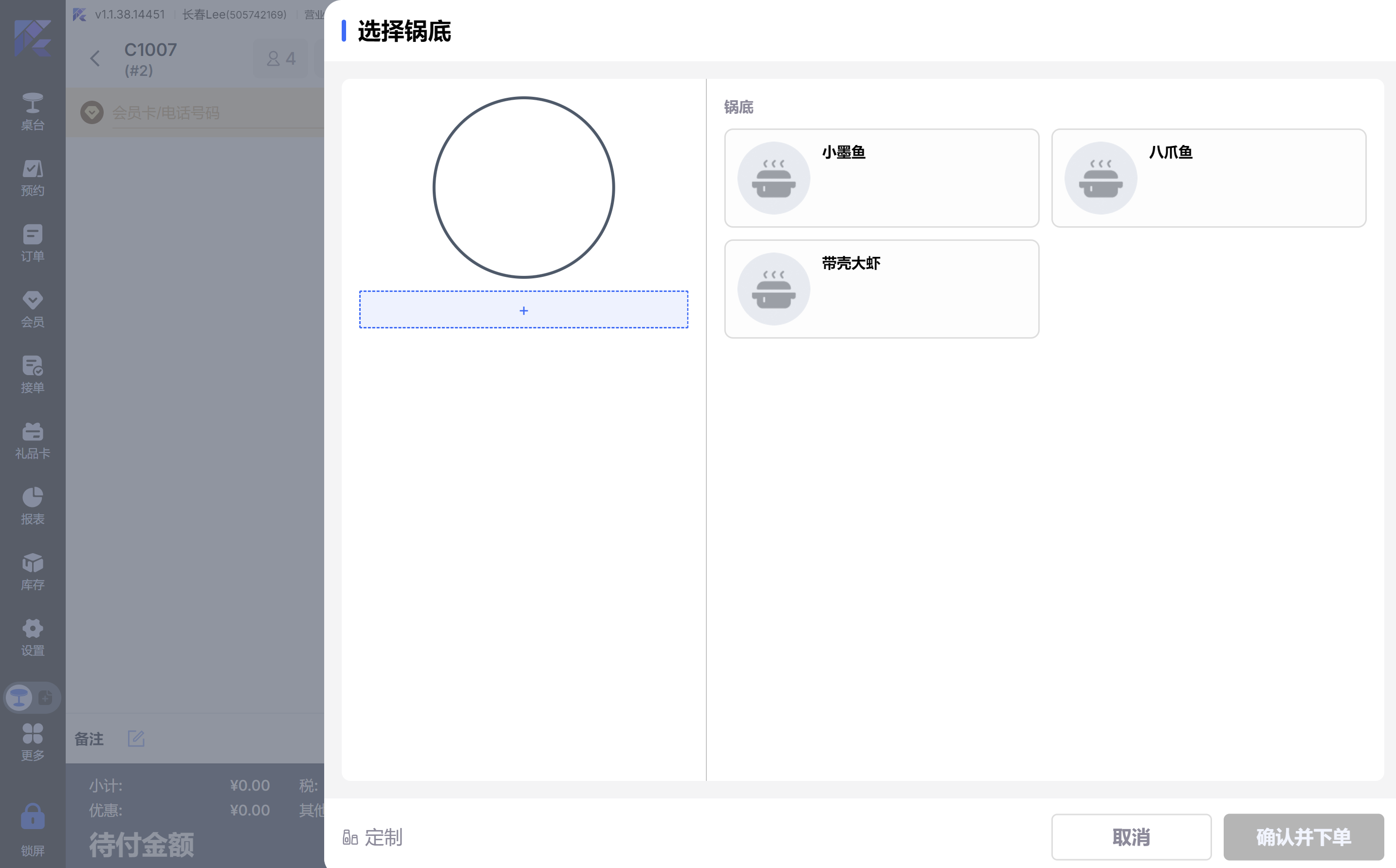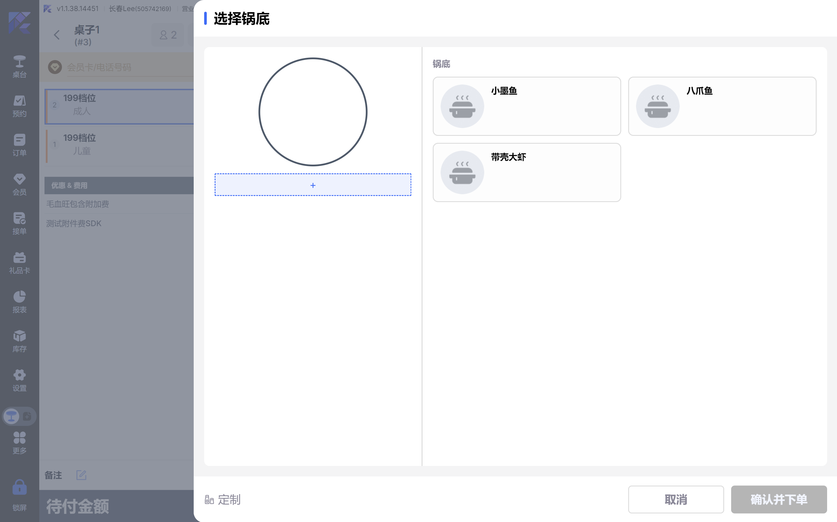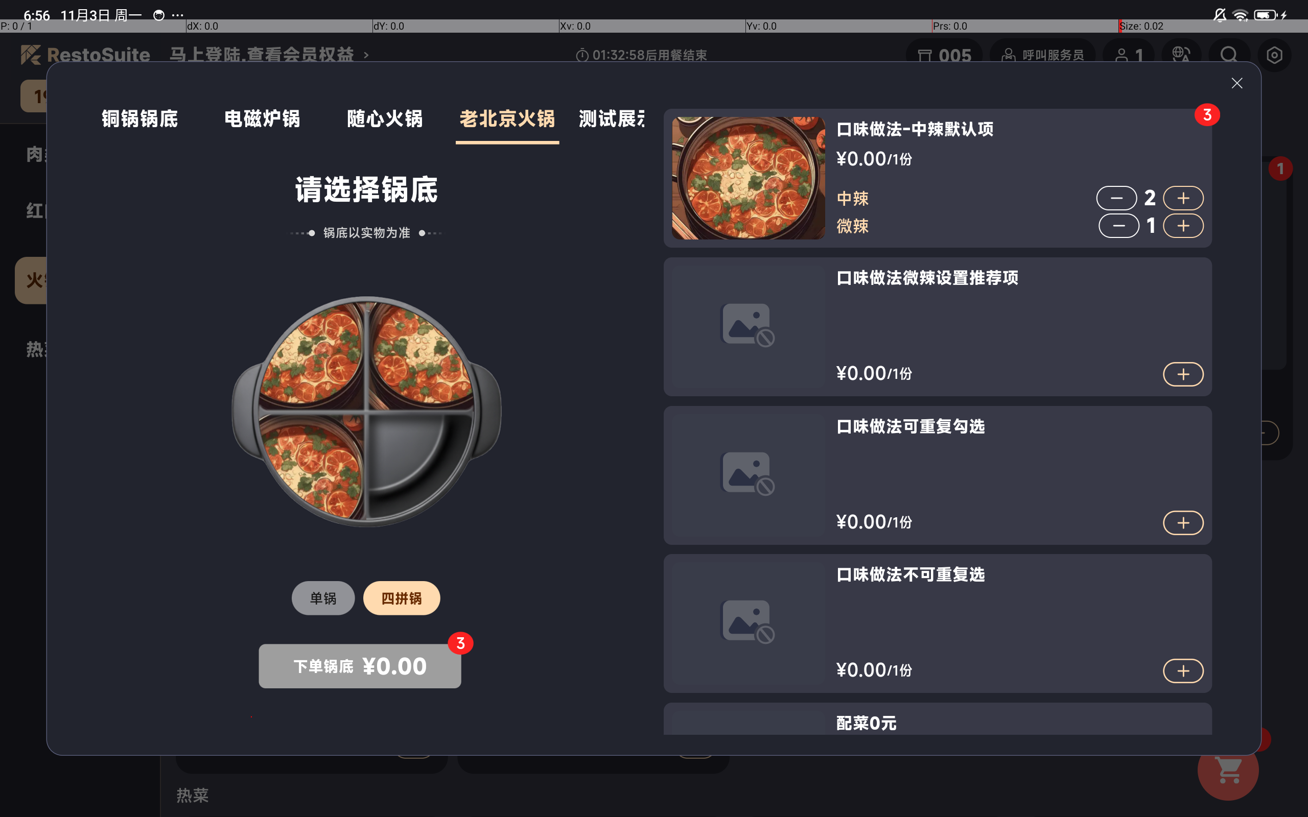 - 参数打开,并且设置了锅底菜品,开单后自动到锅底选择页面,选择锅底及双拼及四拼过等汤底后,确认并提前下单;