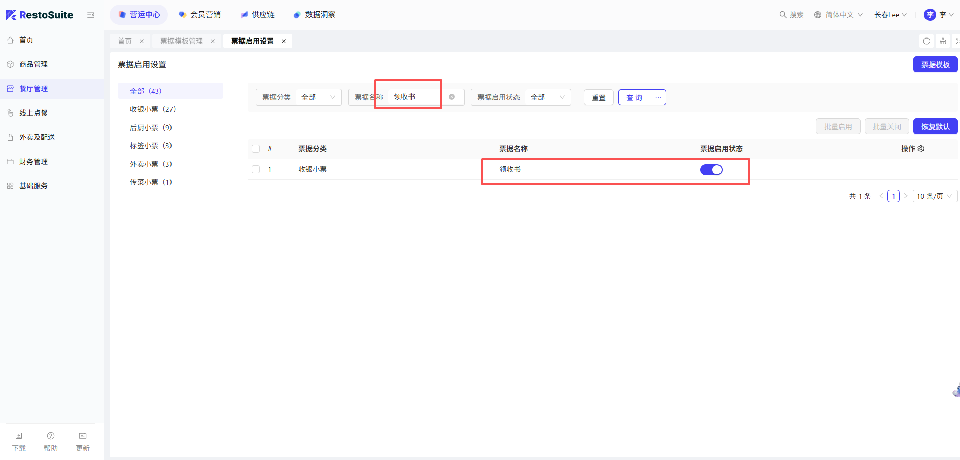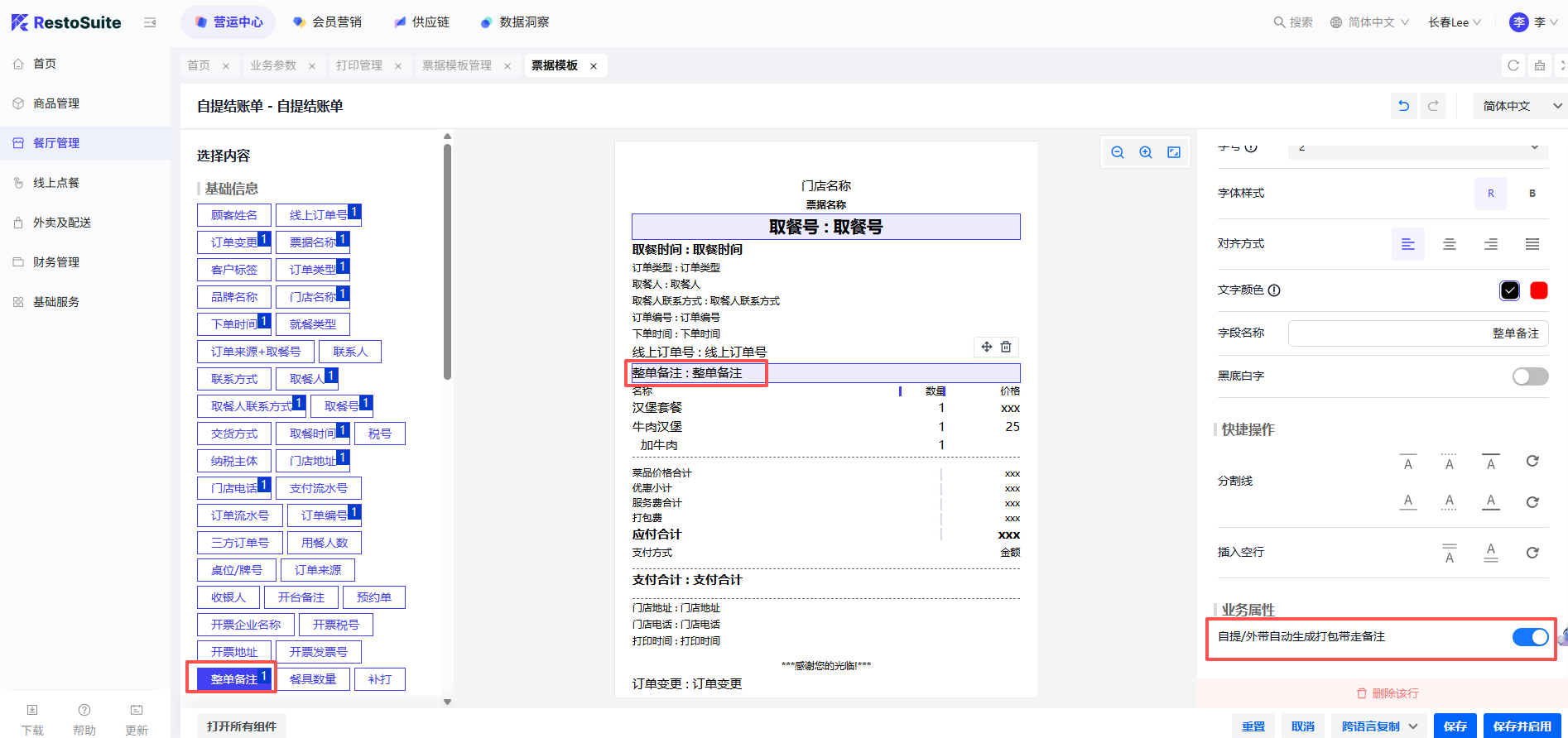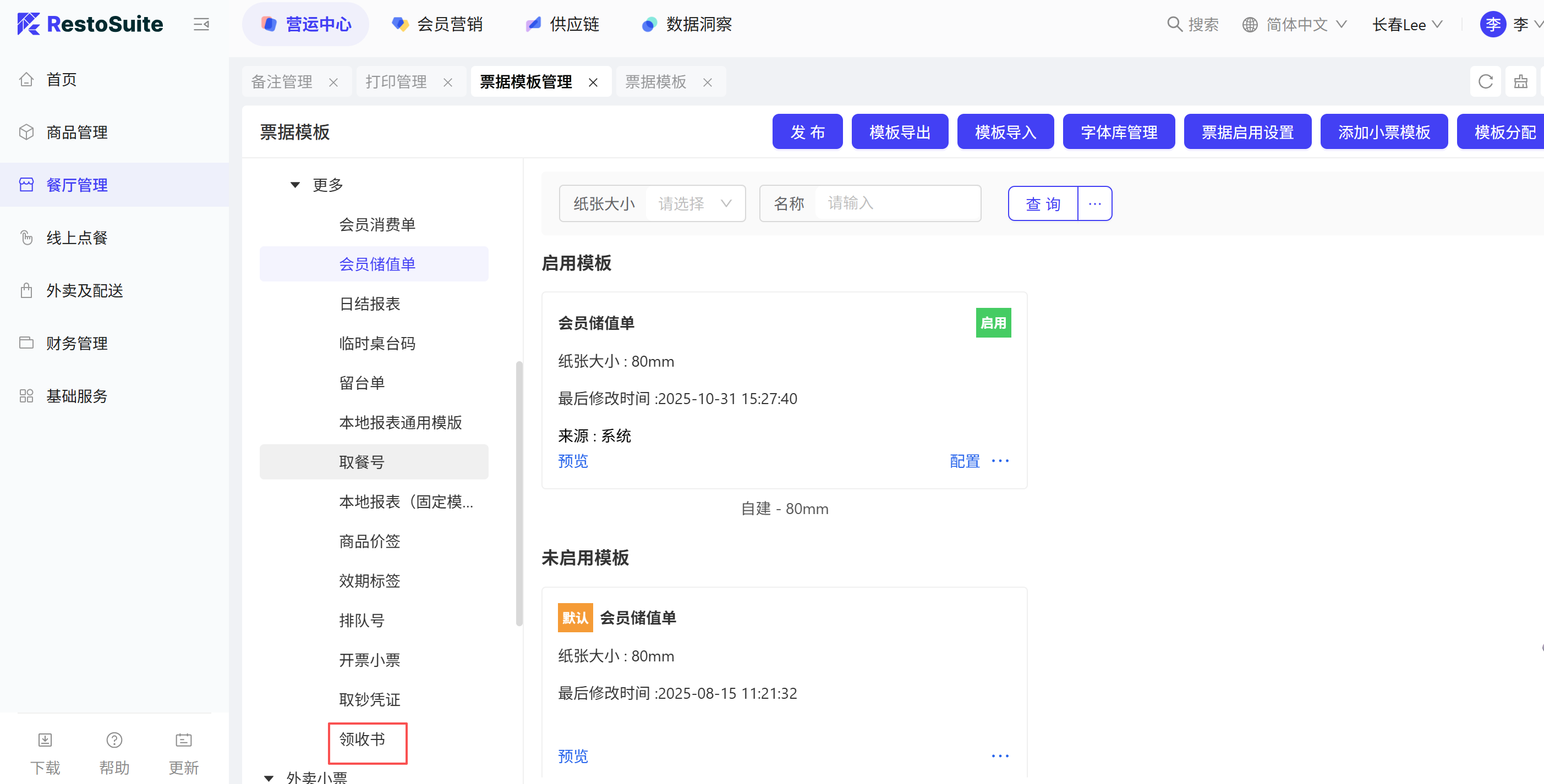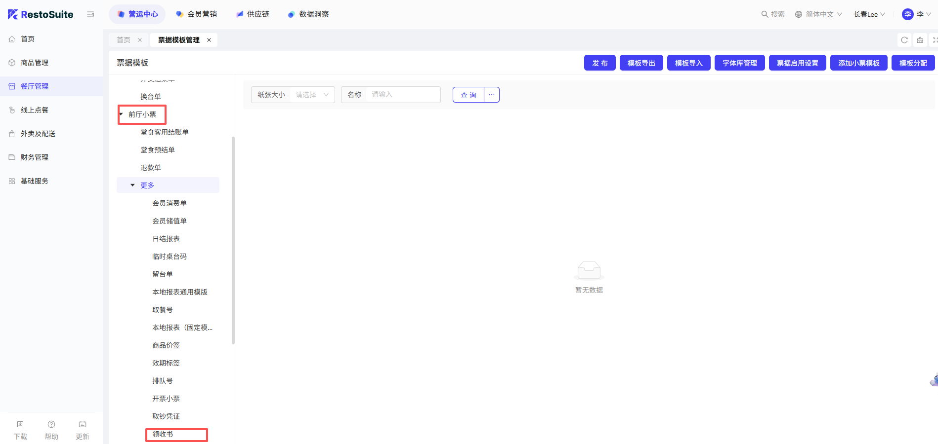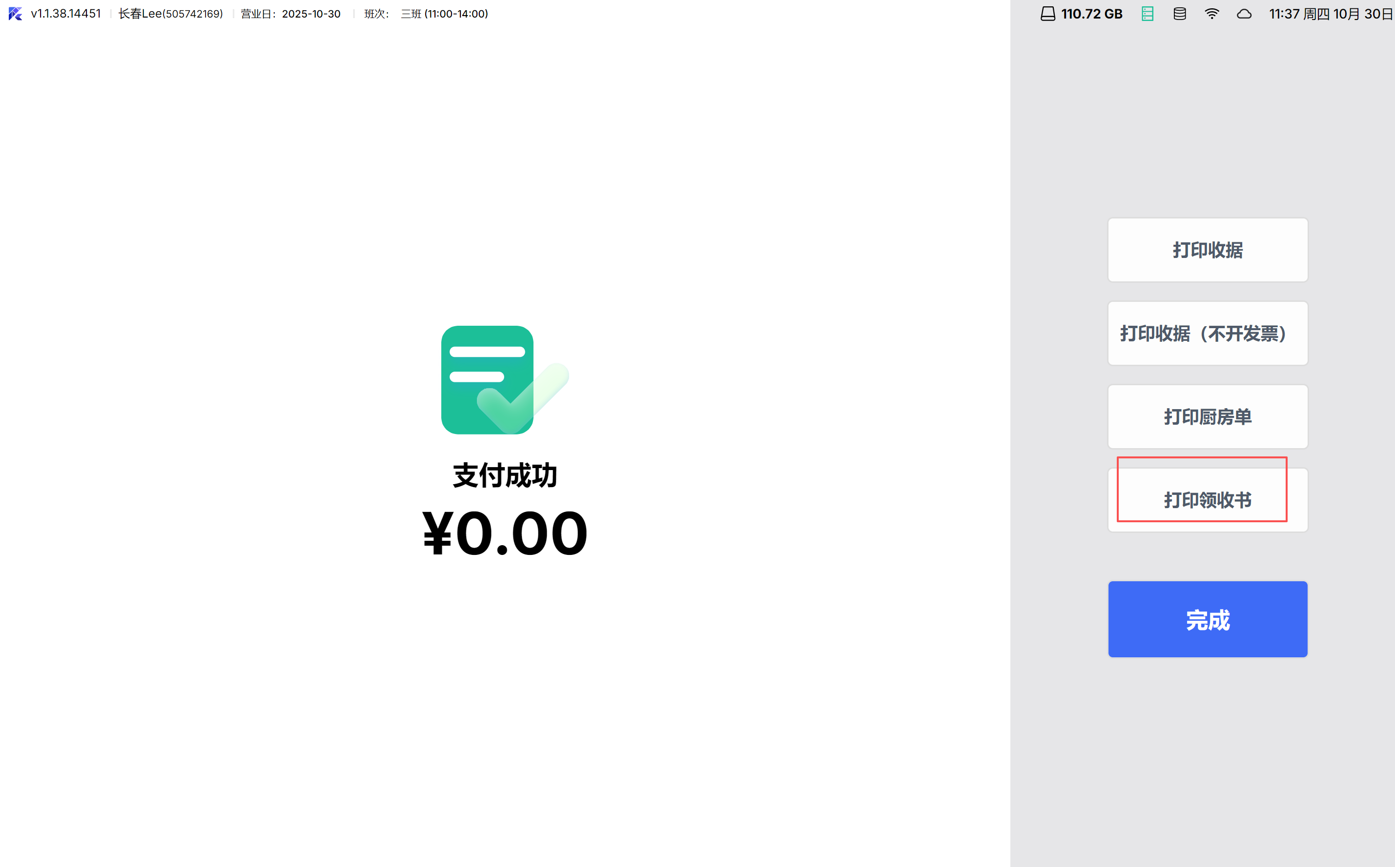 - 使用场景:在结账完成页,可以通过领收书魔板打印领收书小票;