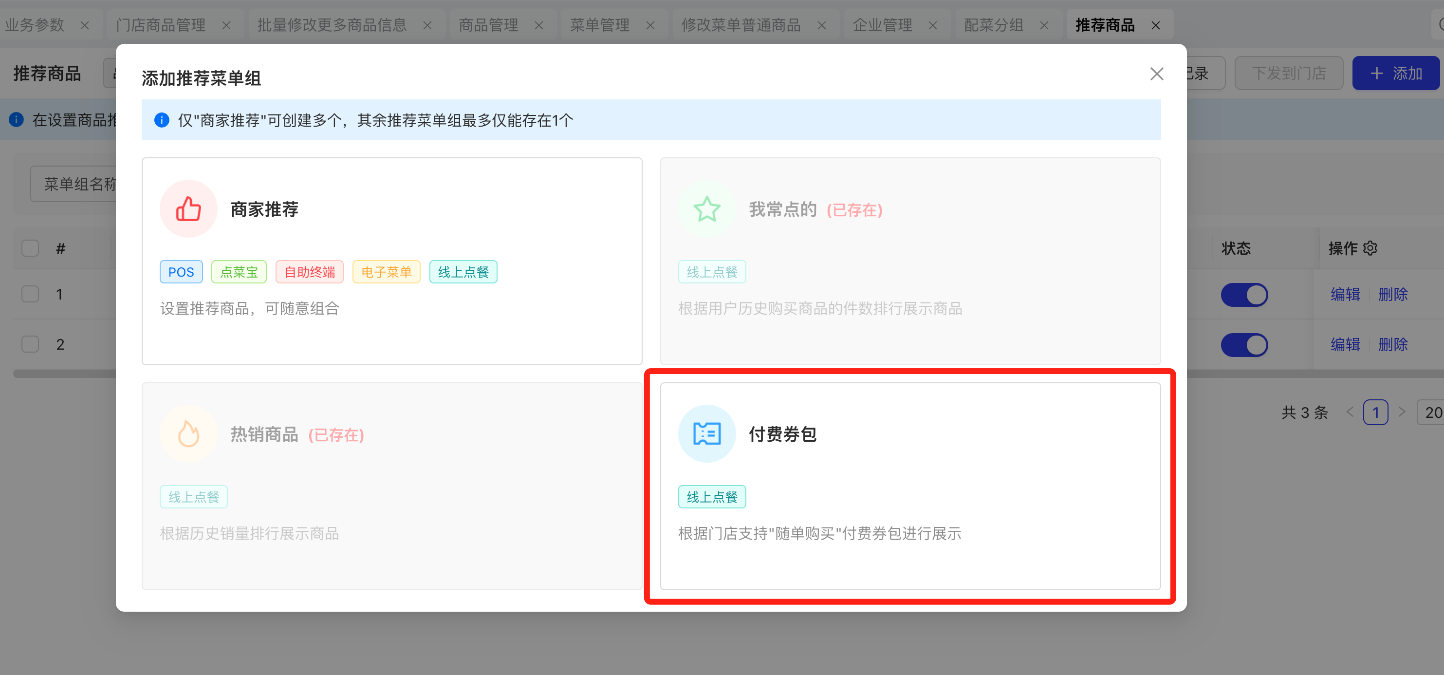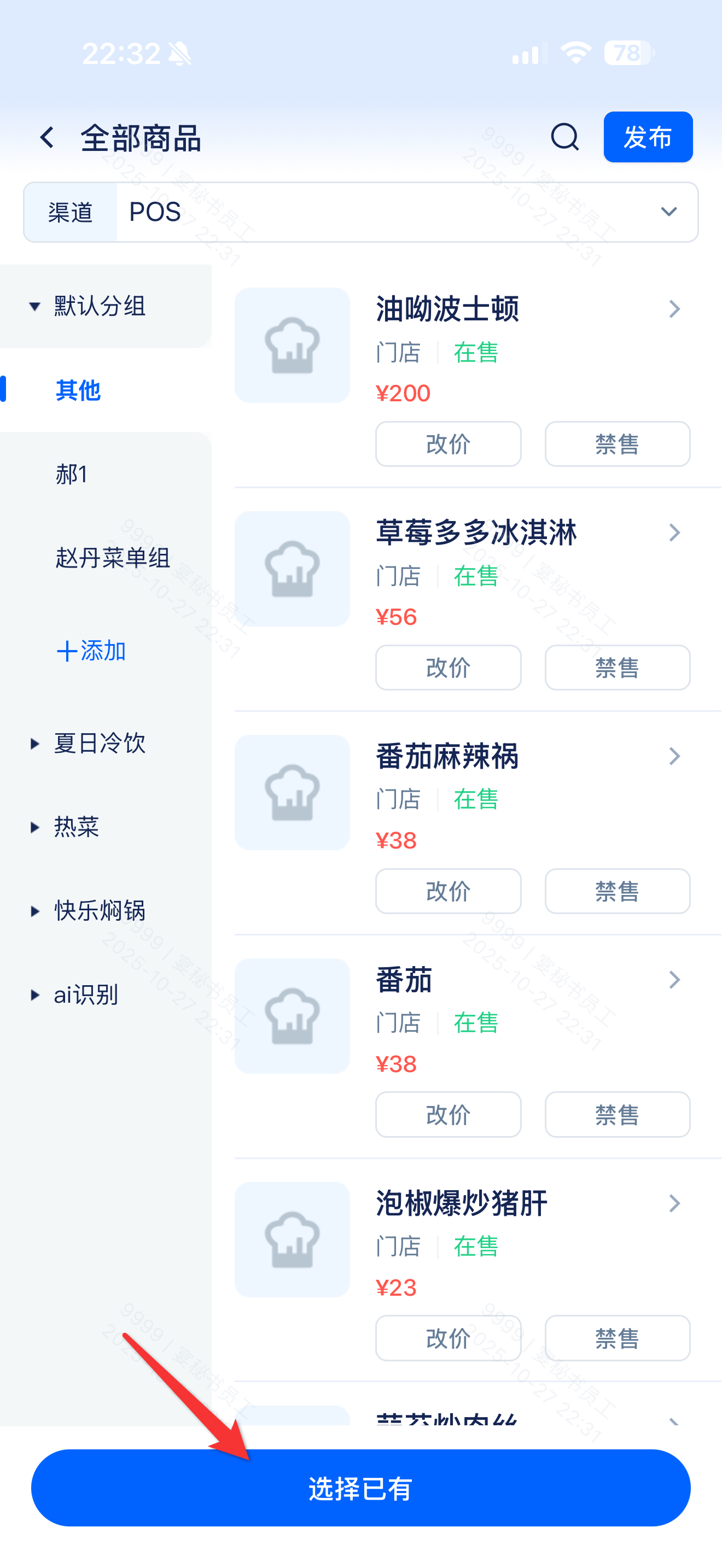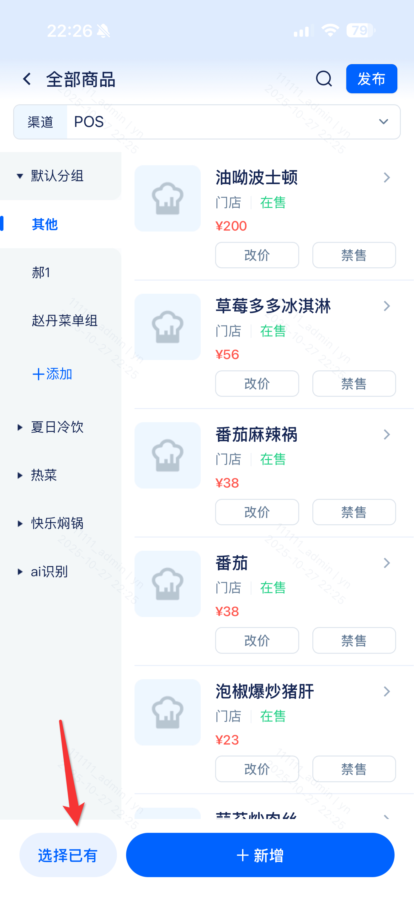 - 使用场景:门店无添加商品权限时,可以选择添加已有,选择品牌商品进行添加