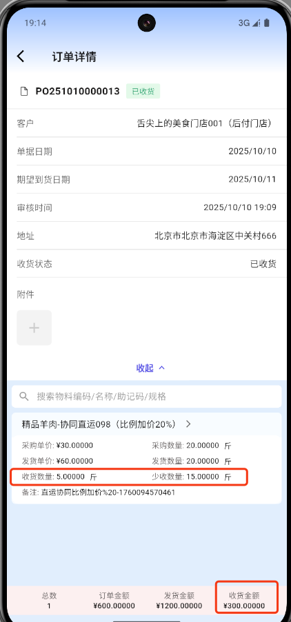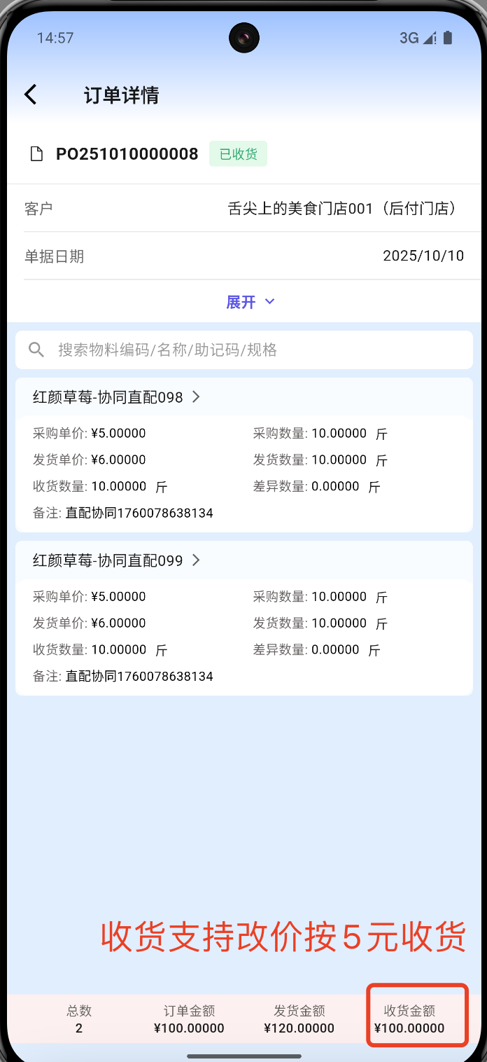 - 协同订单, 门店多次部分收货,更新协同端收货数量,拆分多个收货单后最后一个收货单收货完成,更新协同端的差异数量,平均含税单价=少收金额/少收数量 注意事项