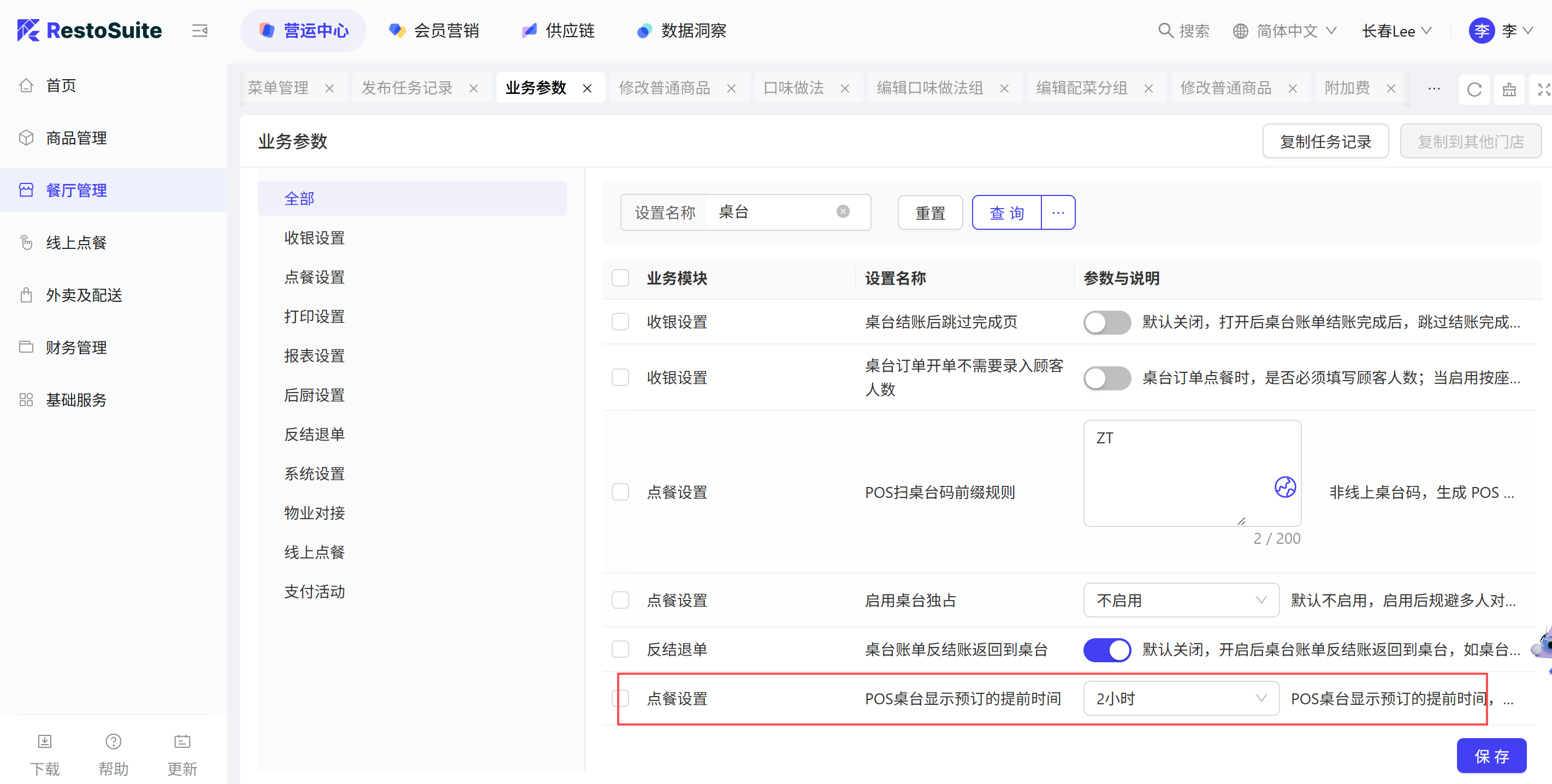 - BO 增加参数:POS 桌台显示预订的提前时间,默认设置:2 小时;可以修改;