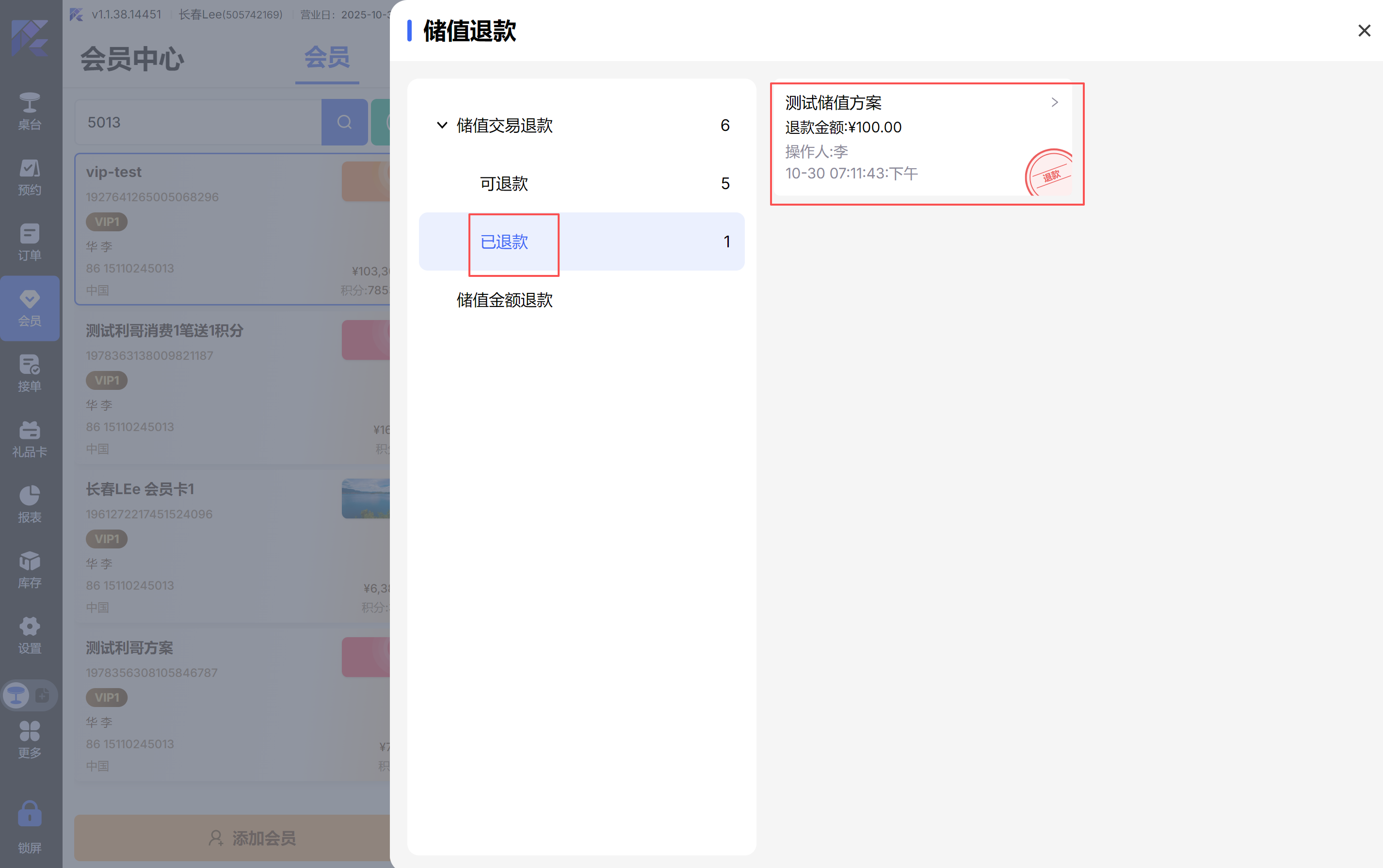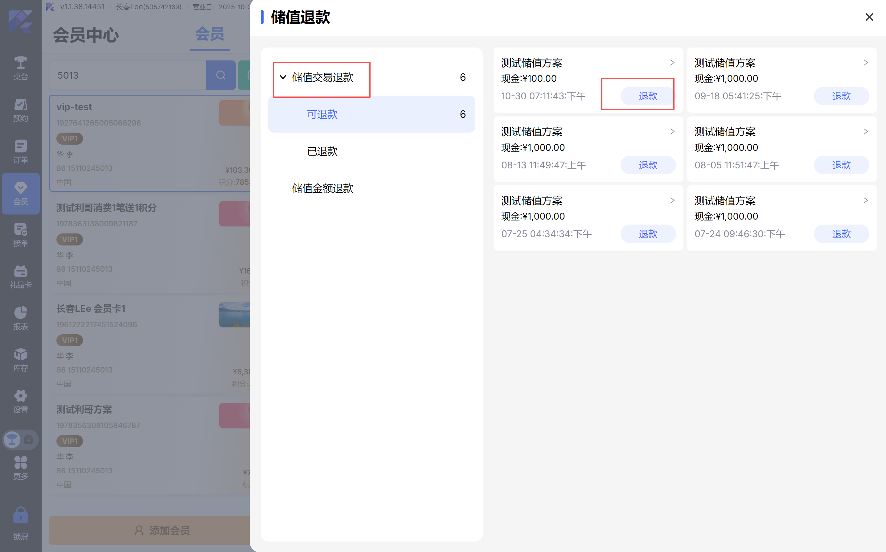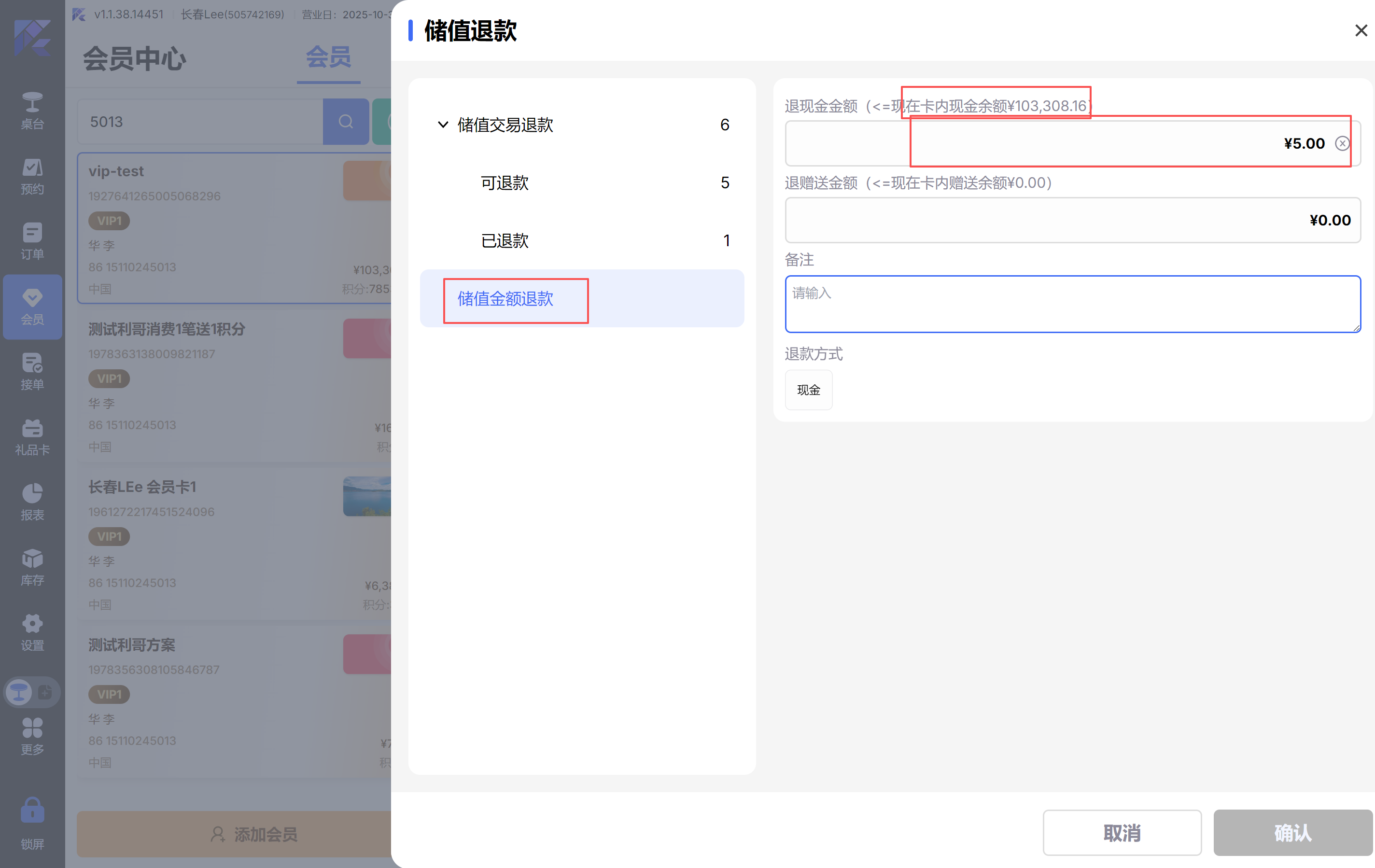 - 使用场景:客人储值后,马上退款或部分使用后的金额退款