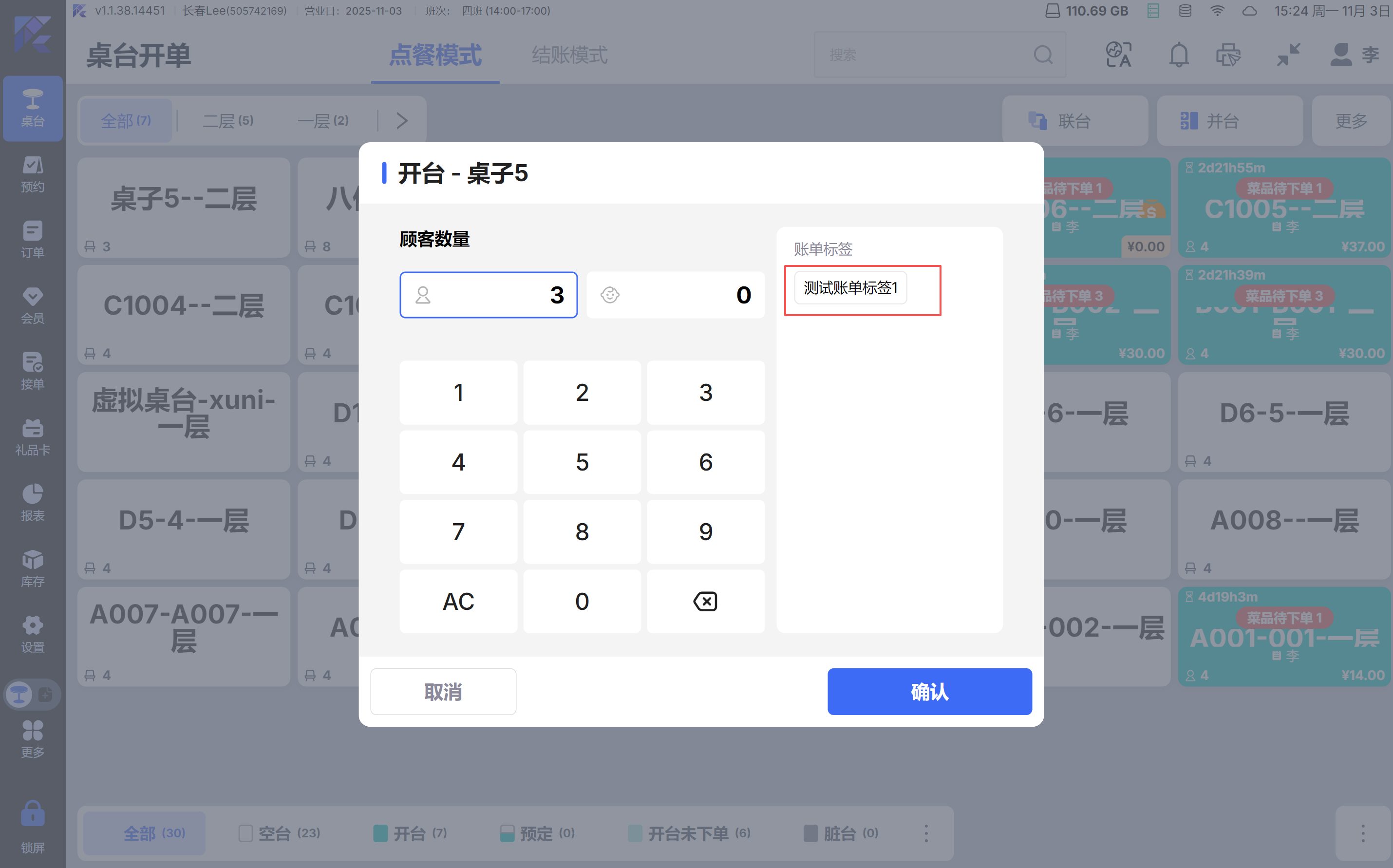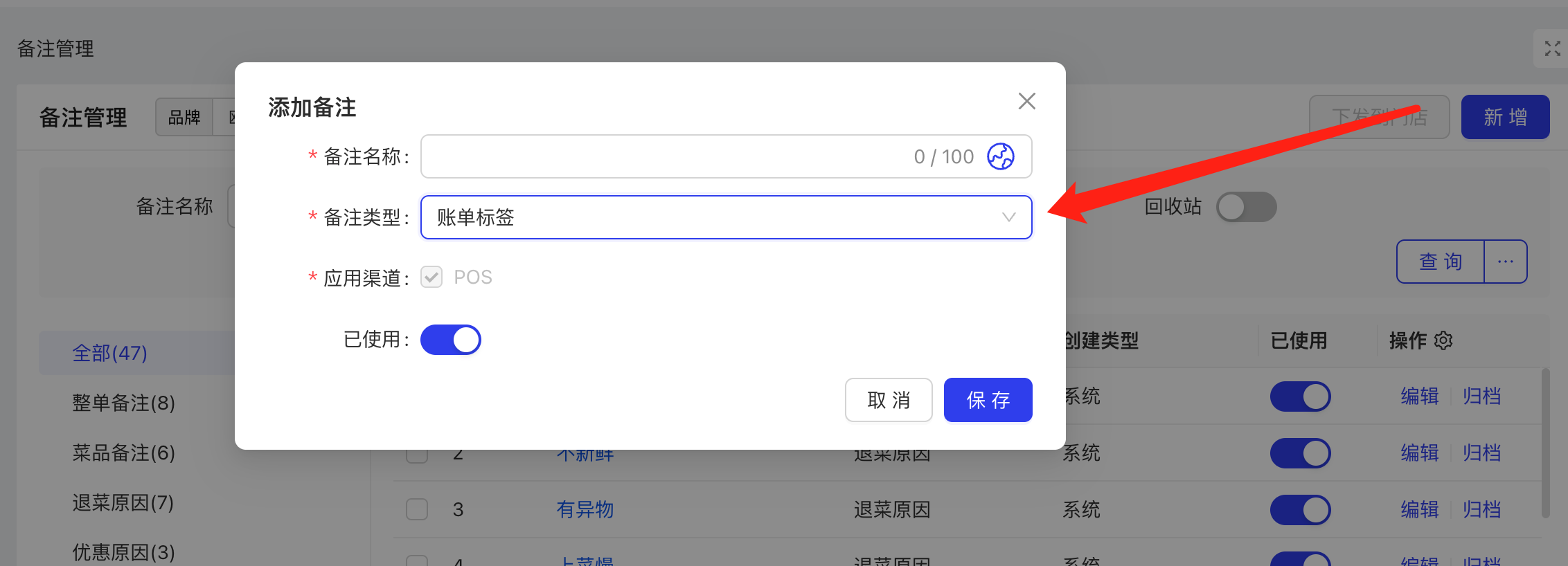 - 开单时,判断 BO 设置了账单标签后,弹窗选择需要的标签,上传云端后供报表统计分析