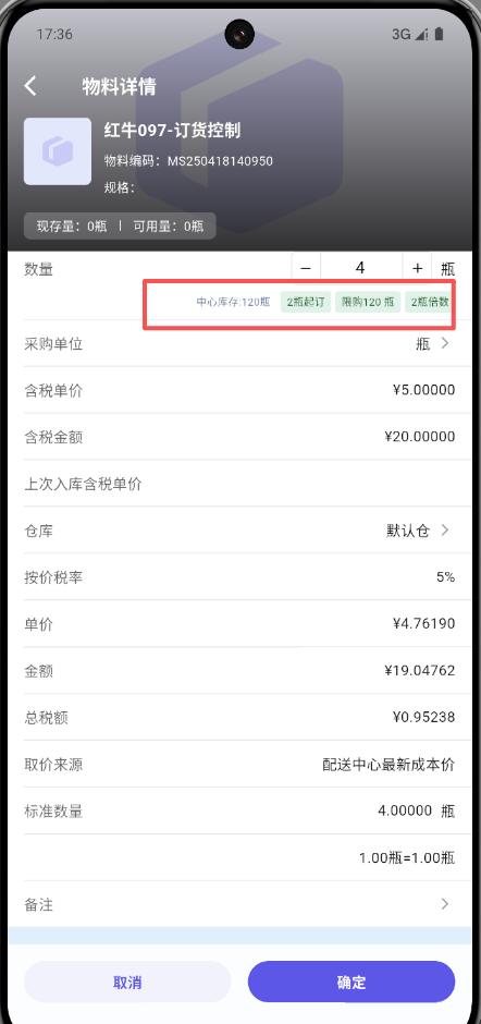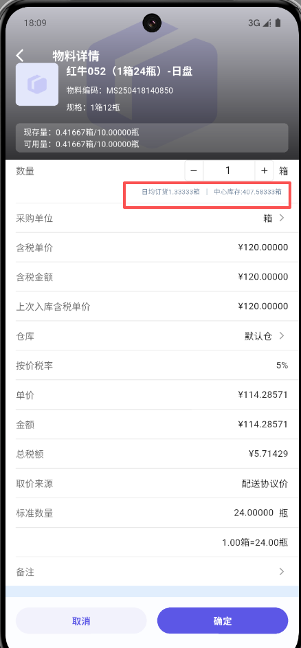- 采购订单/采购申请单,选择物料、物料详情,新增配送中心库存量