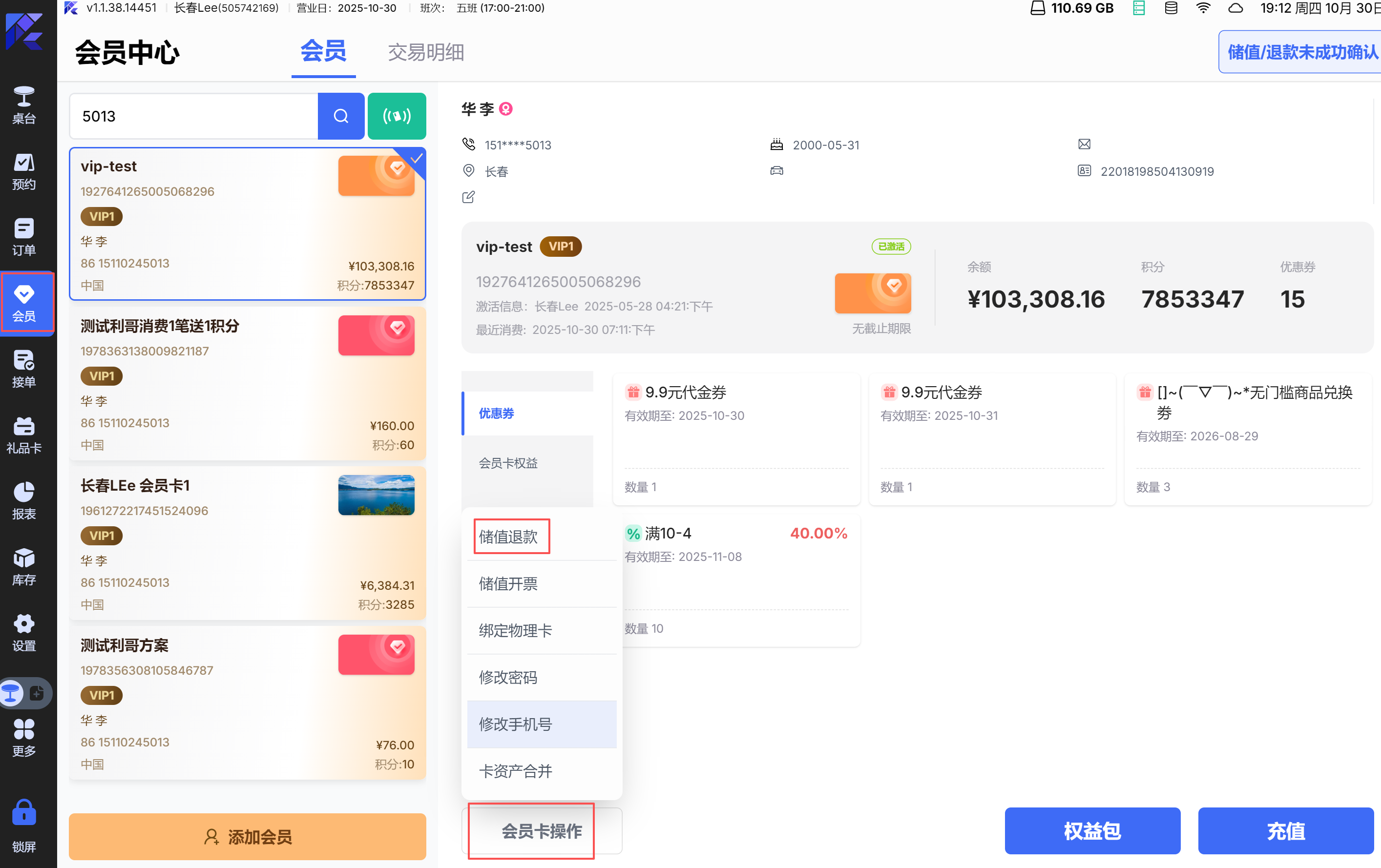 - 在会员操作-卡操作增加-储值退款功能,校验:储值退款的权限;