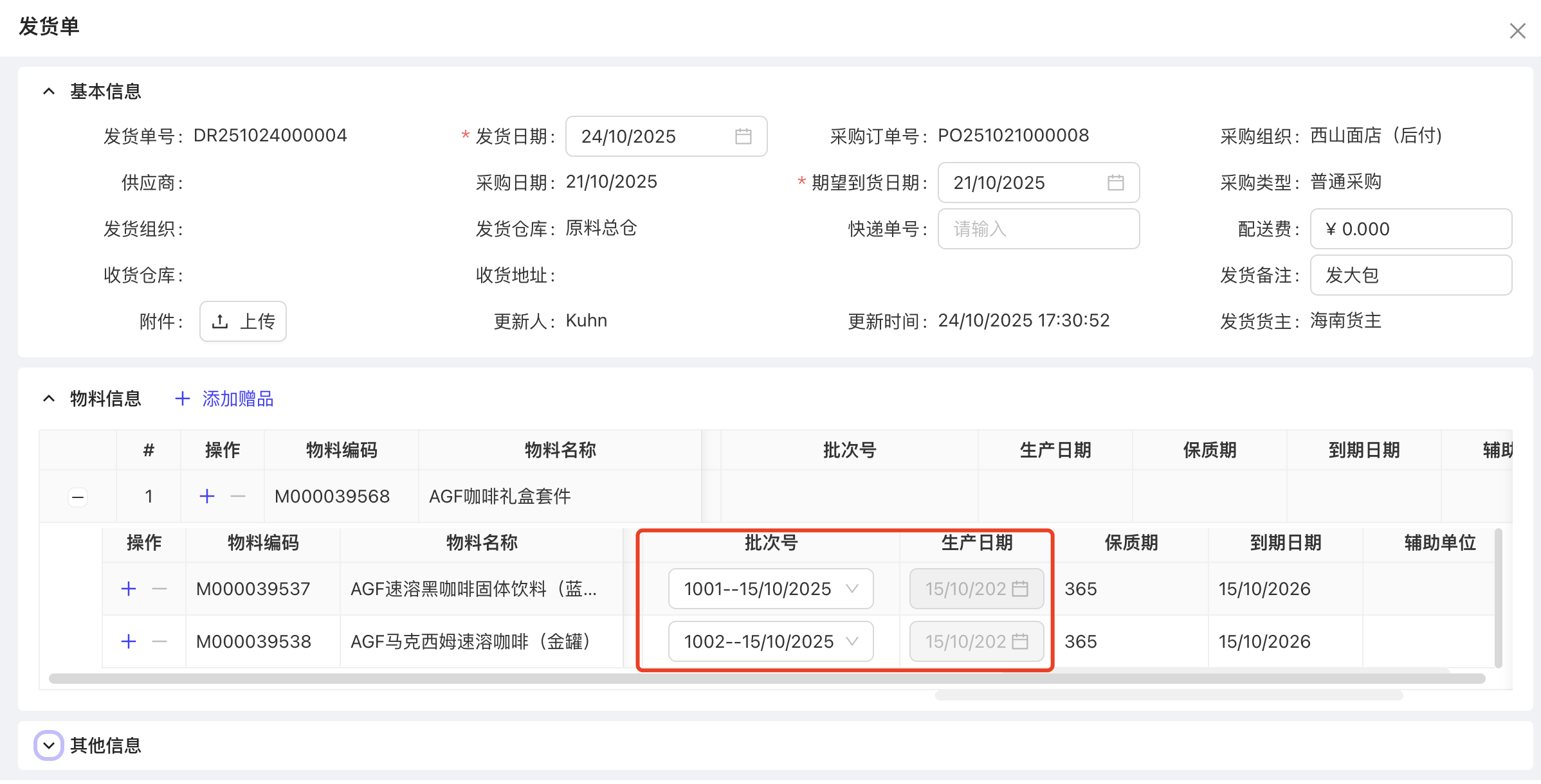 2. 使用场景:当发货的物料中存在成套件,且启用了批次的情况下,通过自动分配批次,快速完成对成套件的批次分配操作