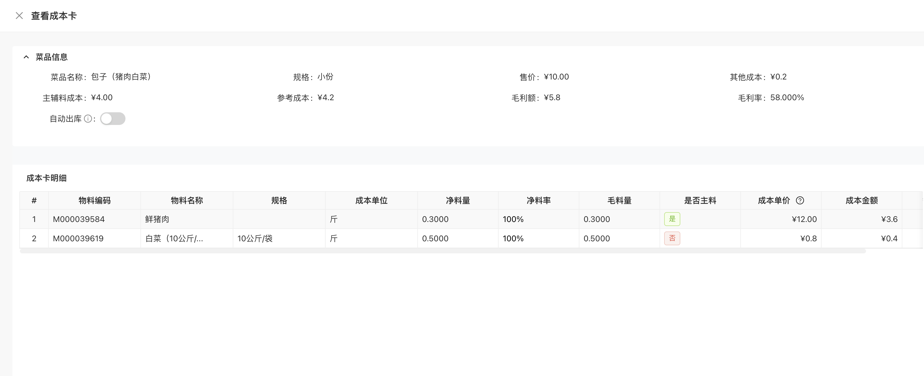 - 功能简介:查看指定门店菜品成本卡时,可方便的看出菜品的参考成本。需要注意的是物料的成本单价为实时获取,因此菜品的参考成本是在变化的,仅作为参考。