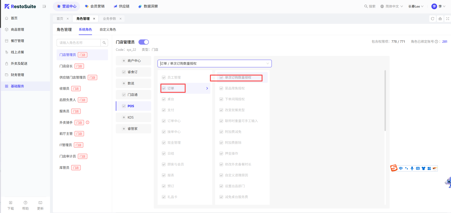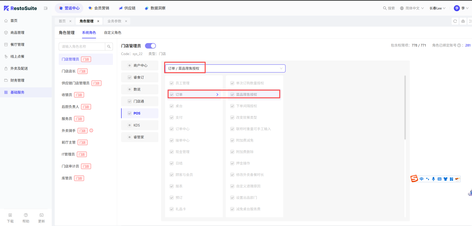 - 增加权限:菜品限售授权:解除自助餐菜品里设置的按单、按人的点菜数量限制及菜品上设置的单点菜品的限购数量 的配置项;