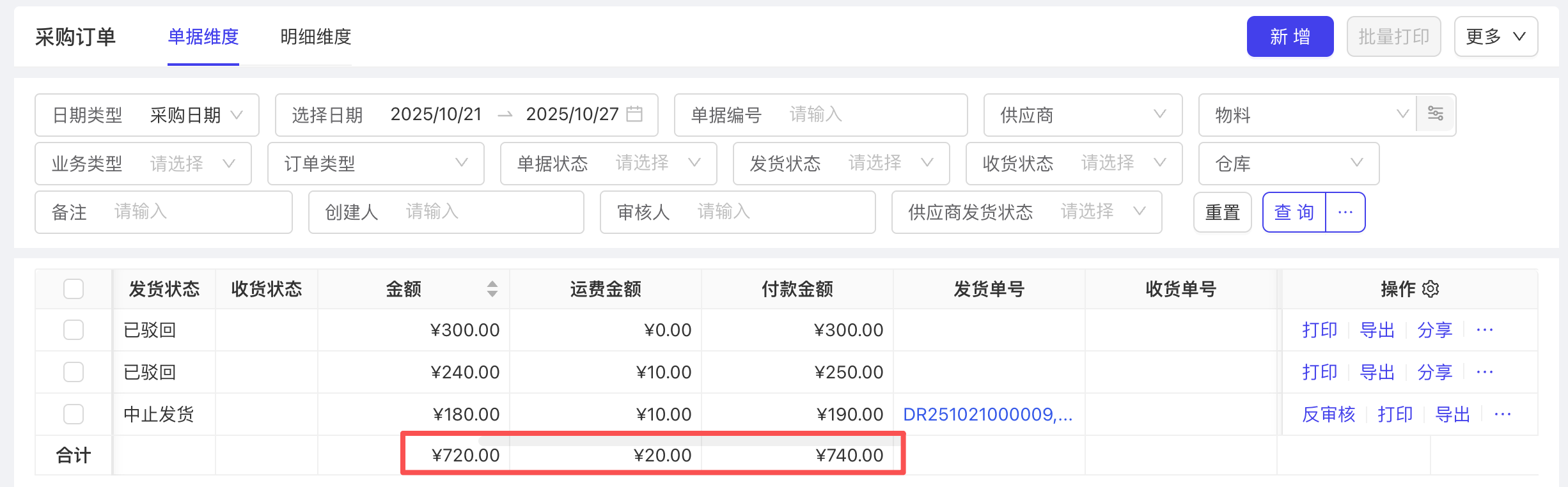 - 采购订单,按单维度,金额+运费金额+付款金额,增加合计行,按明细维度,按量税额+按价税额+总税额增加合计行