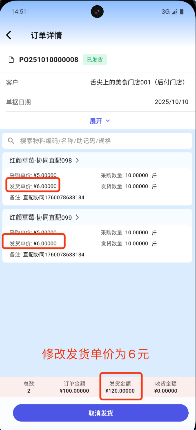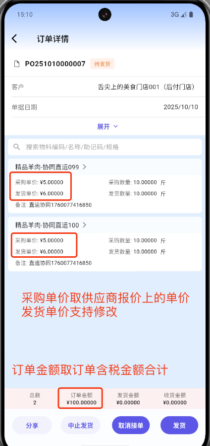 - 供应商APP发货后,可设置在pc端发货端是待发货状态(开发绑定供应商),支持再次修改采购含税价格,更新发货单、配送出库、采购入库单,修改发货数量,回更供应商协同APP端发货数量和发货金额
