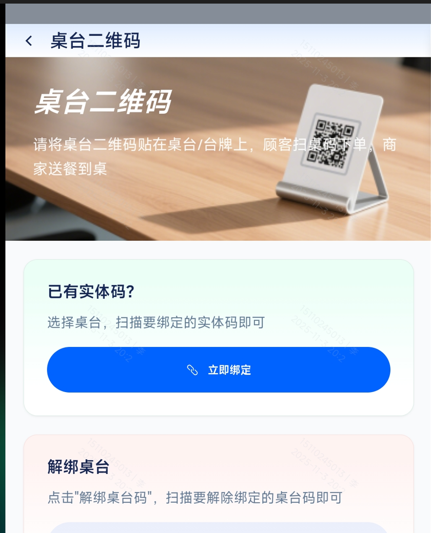- 桌台二维码:可以绑定空二维码,解绑桌台二维码