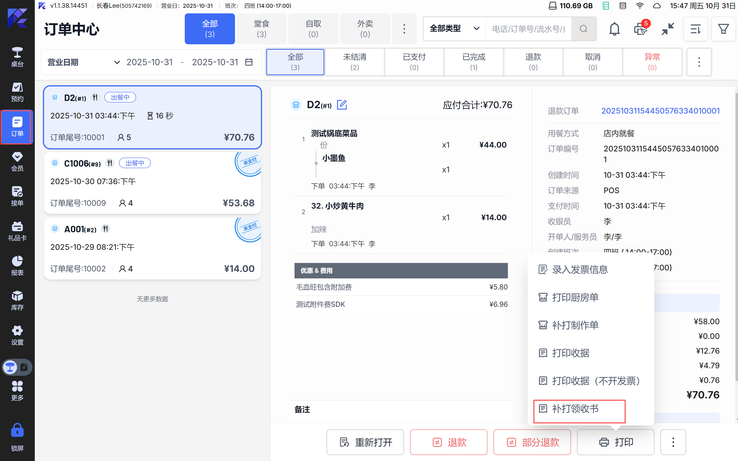 - 选择线下支付方式,完成金额退款;打印退款凭证;