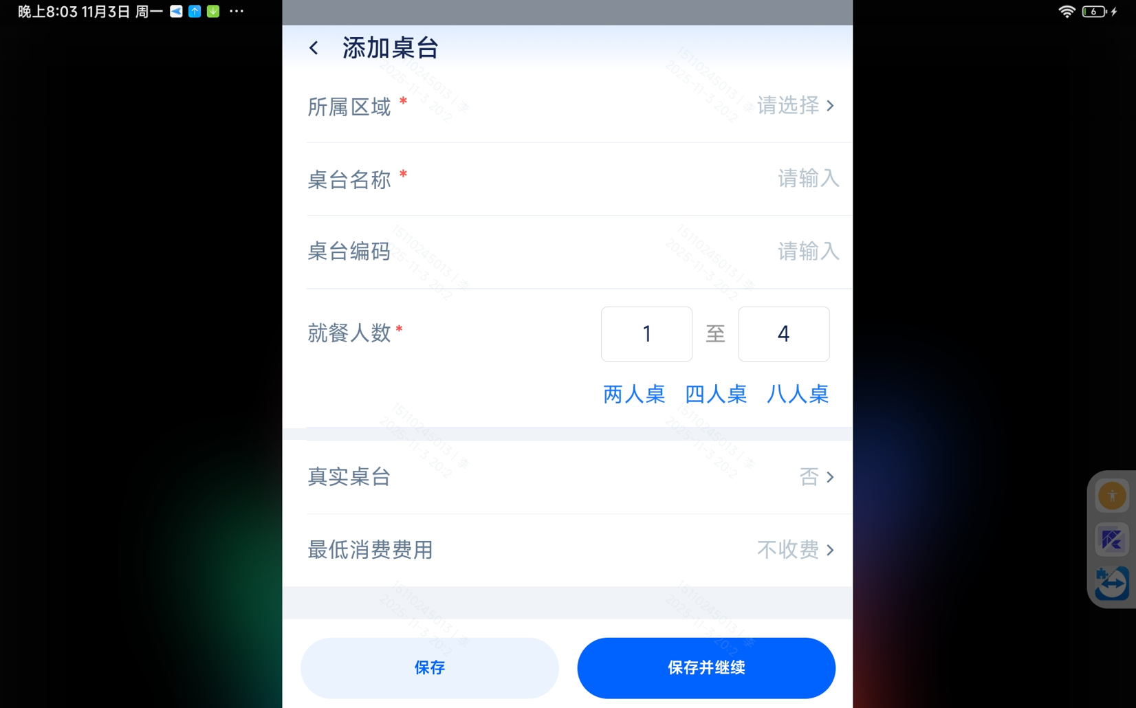 - 桌台列表,可以进行新增(批量)、删(批量)、修改(批量),桌台的排序