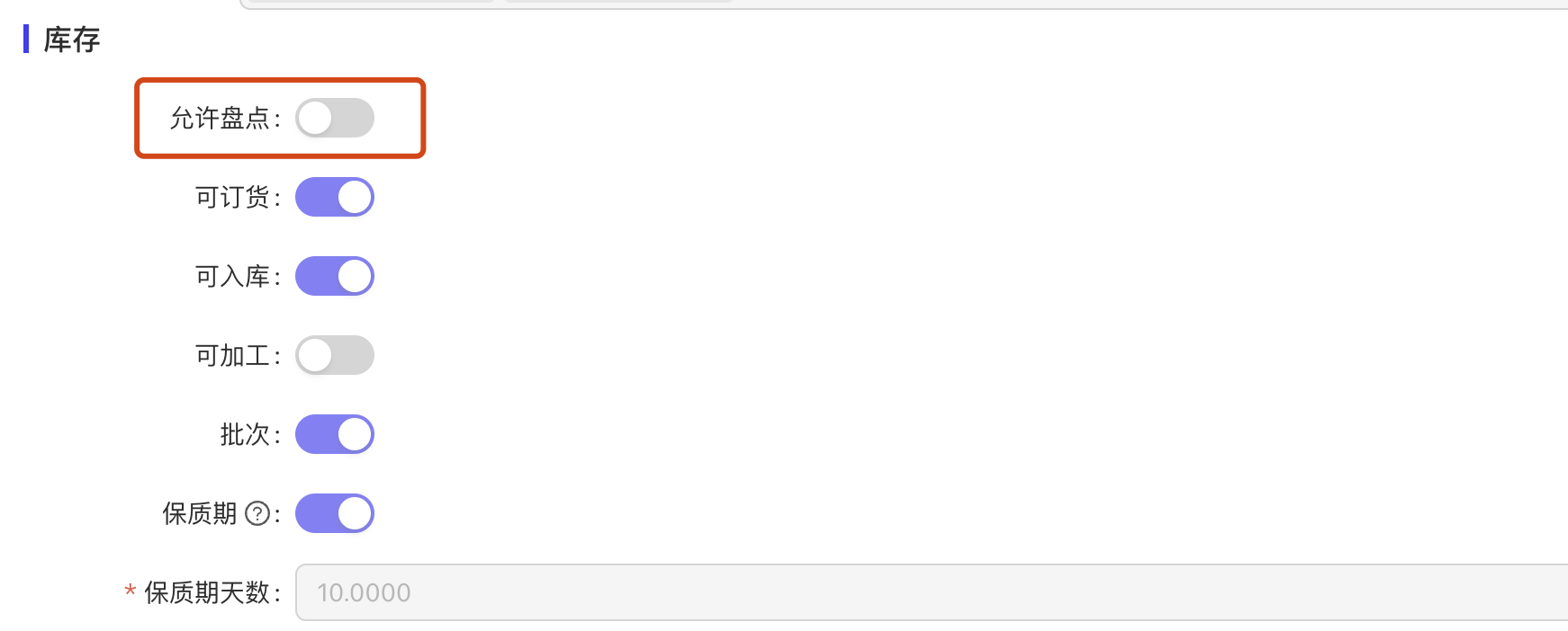 - 功能简介:对于临时盘点类型而言,选择物料时,不受物料盘点频次属性限制,设置为禁盘的情况下仍可选择到盘点清单中。