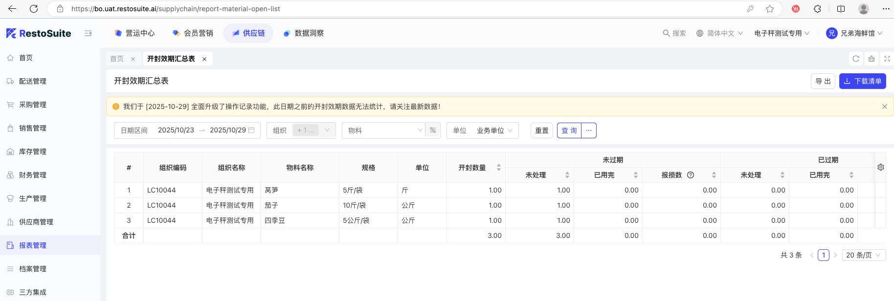 - 【注】升级了开封效期功能的扩展性,将每一次开封以及不同状态的变更均详细记录,由于扩展字段的增加,上线前的历史数据无法统计,该报表仅对新产生数据有效。