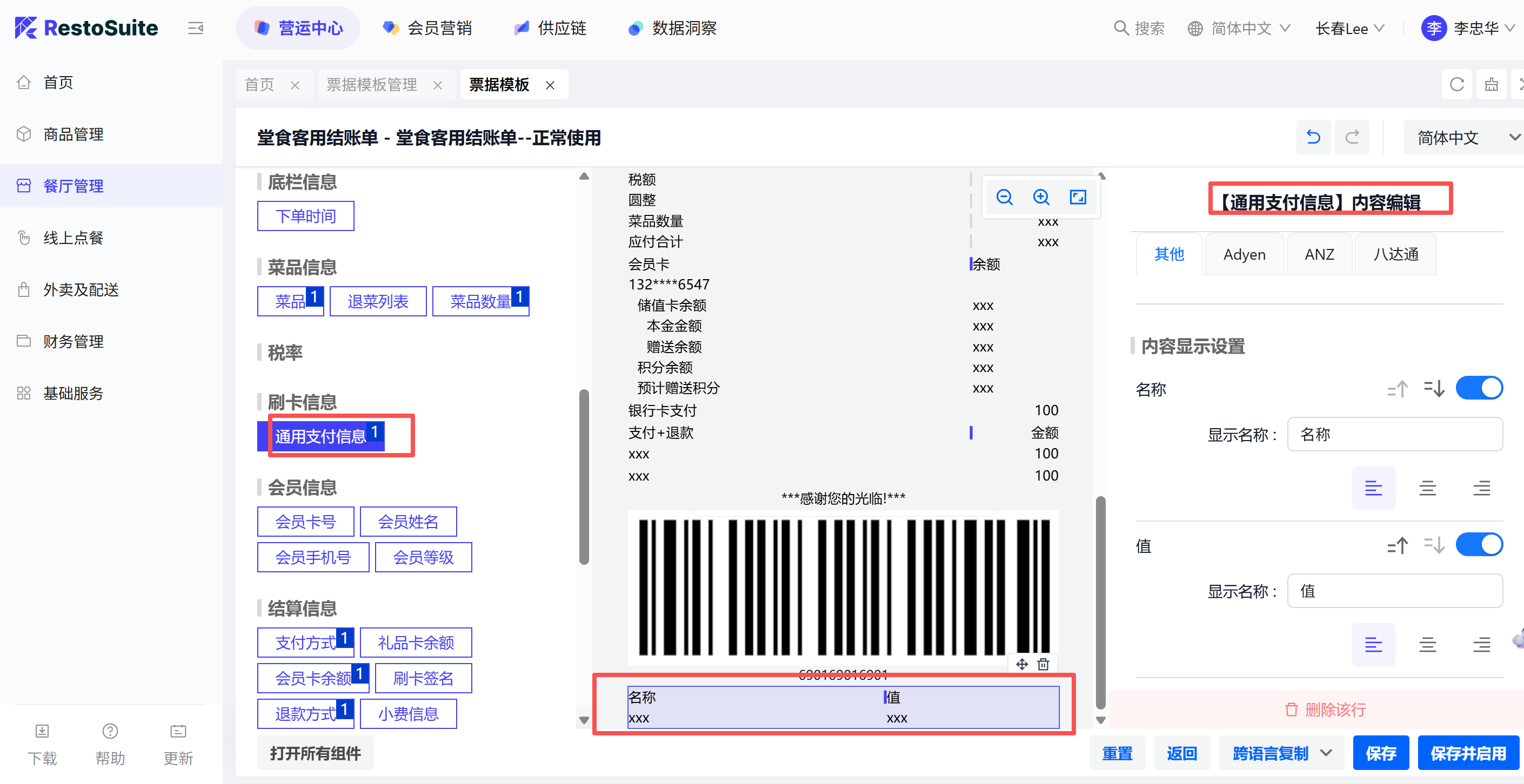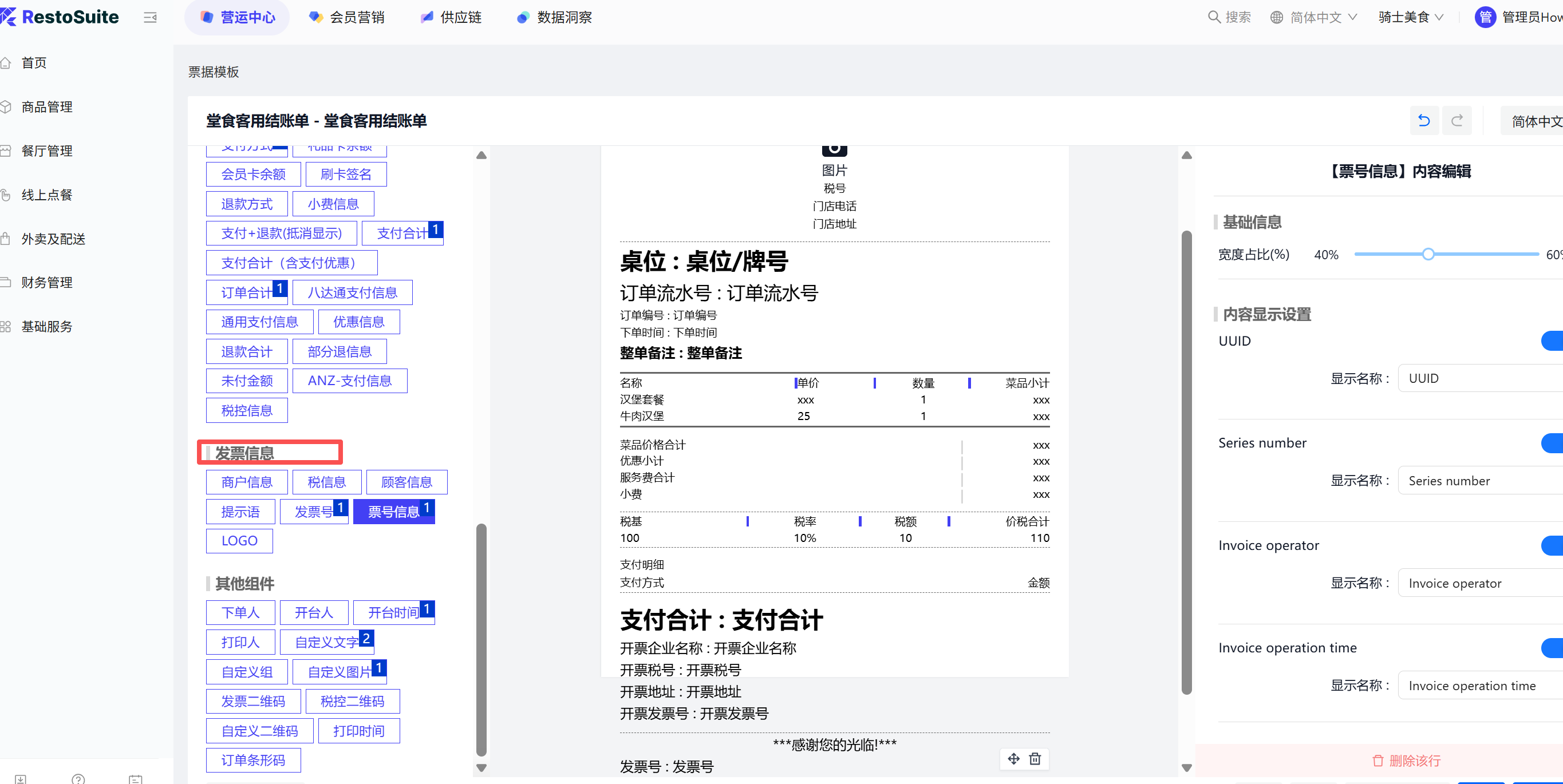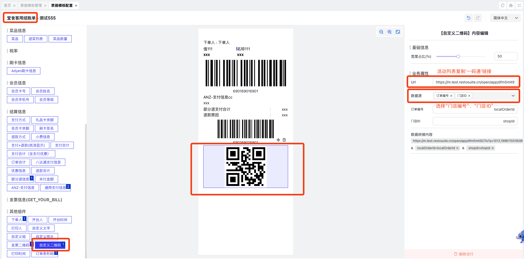 - 将”发票信息“通用组件添加所有需要打印的票据类型中,即堂食客用结账单、自提结账单、外卖商家联、外卖顾客联、退款单