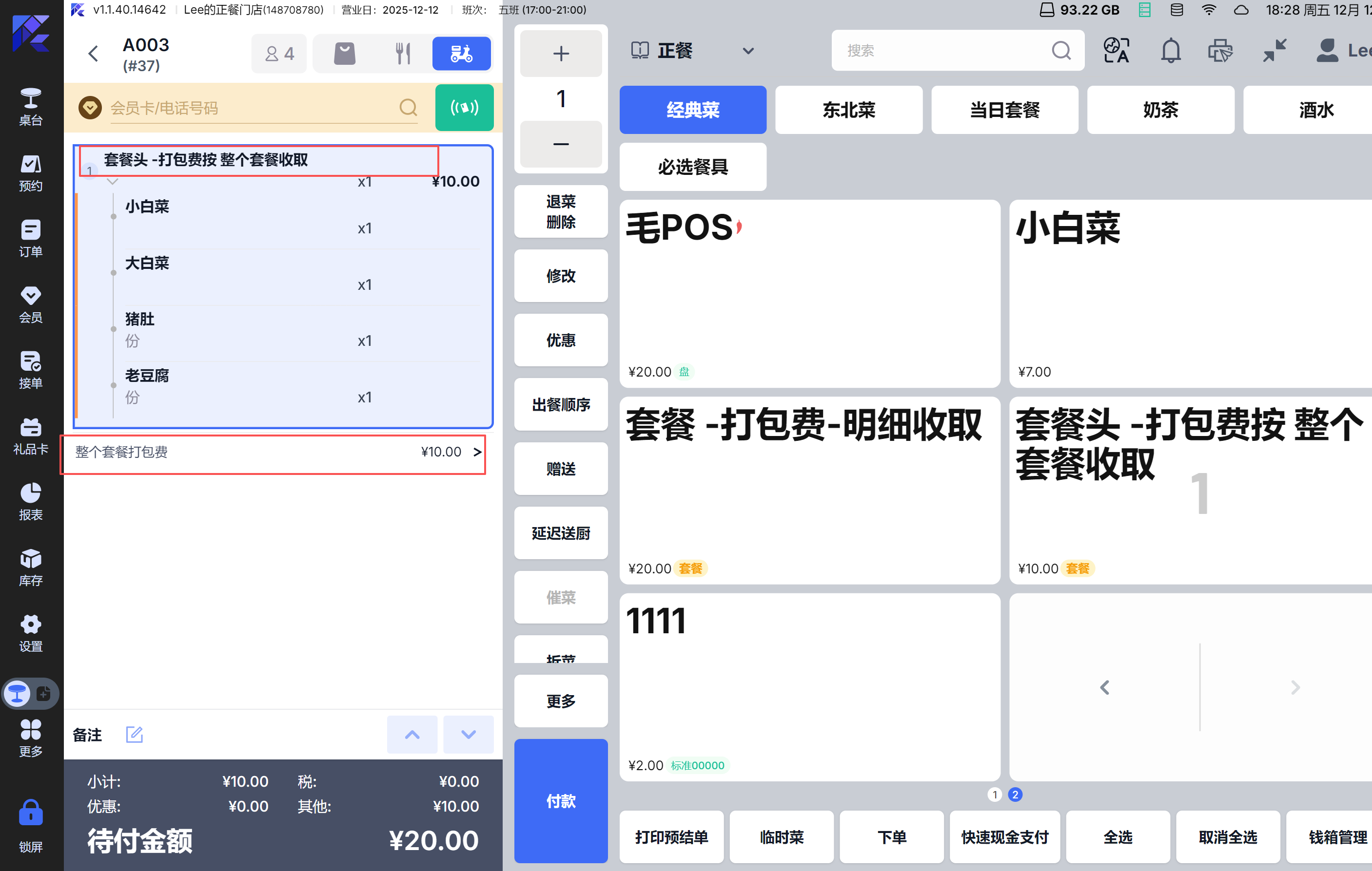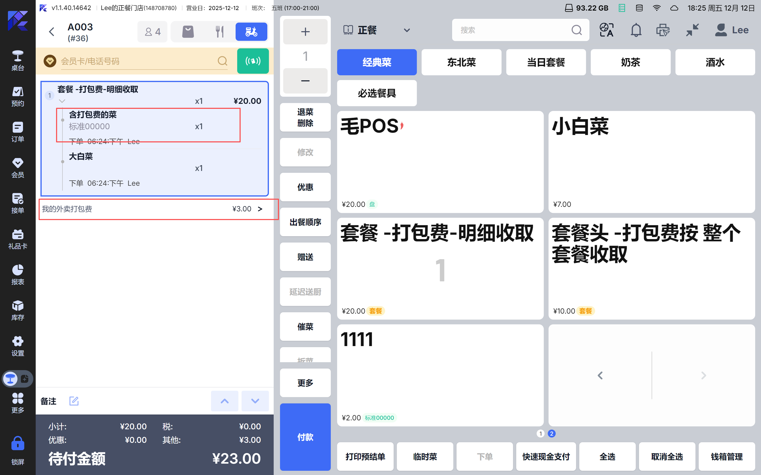 - 按套餐明细收取时,可以选择哪些明细菜品收取打包费;收取多个打包费;