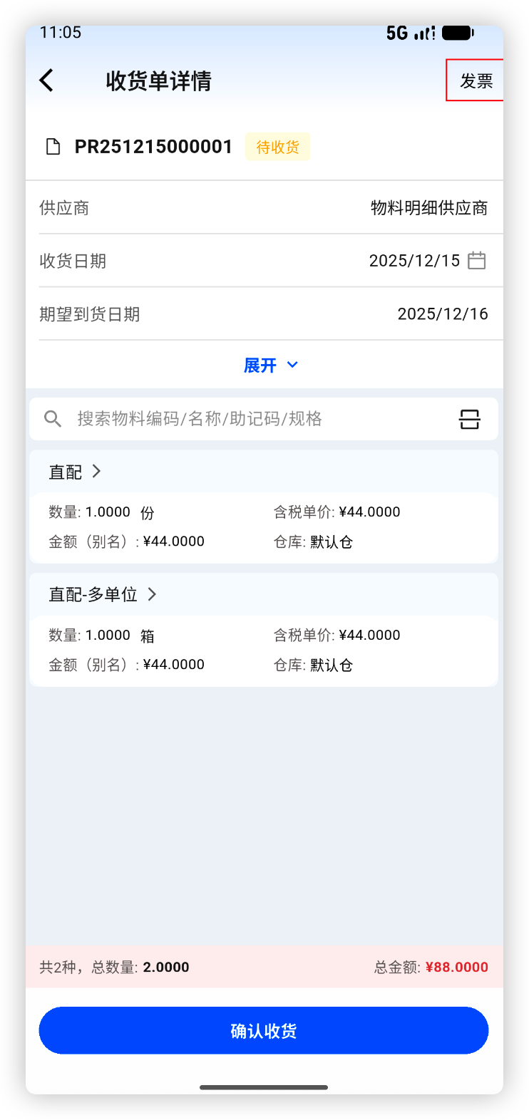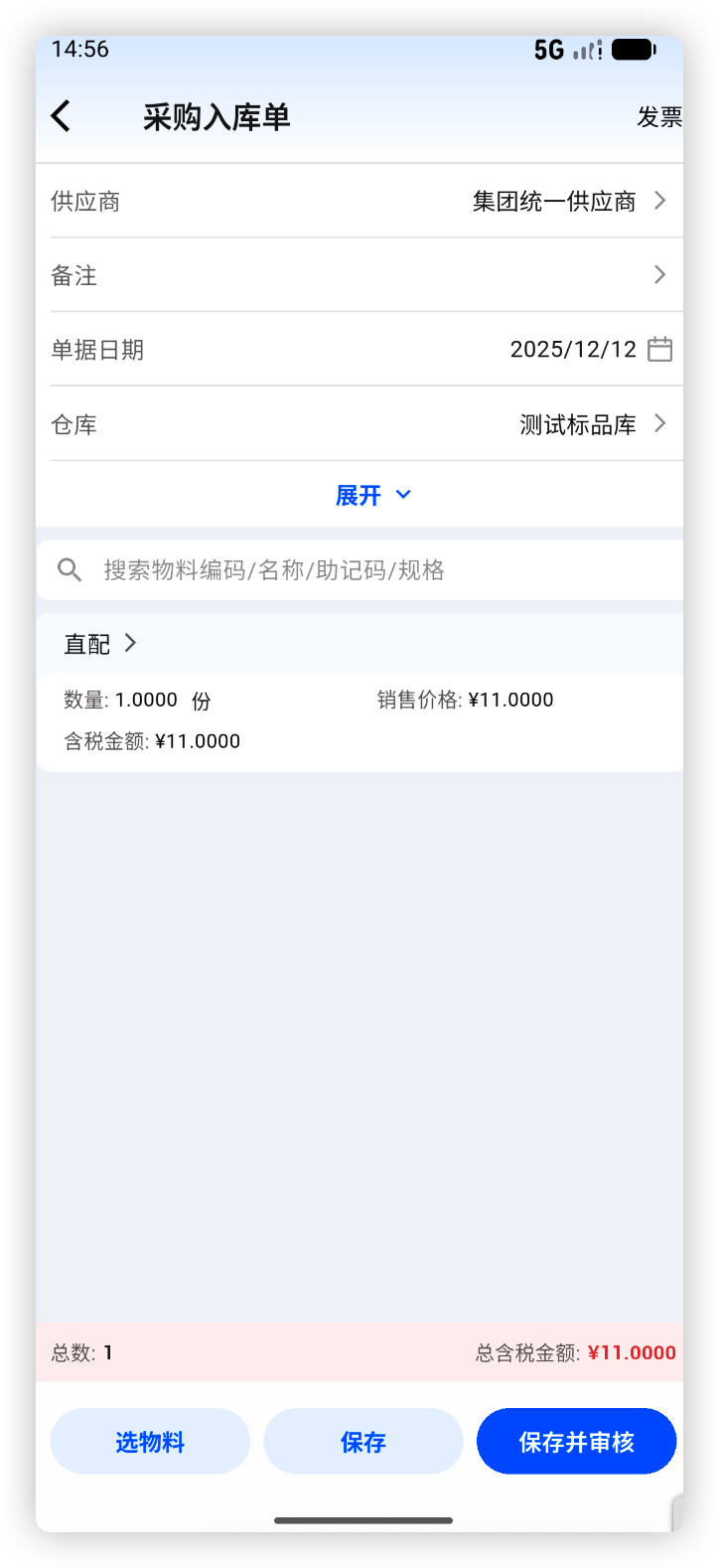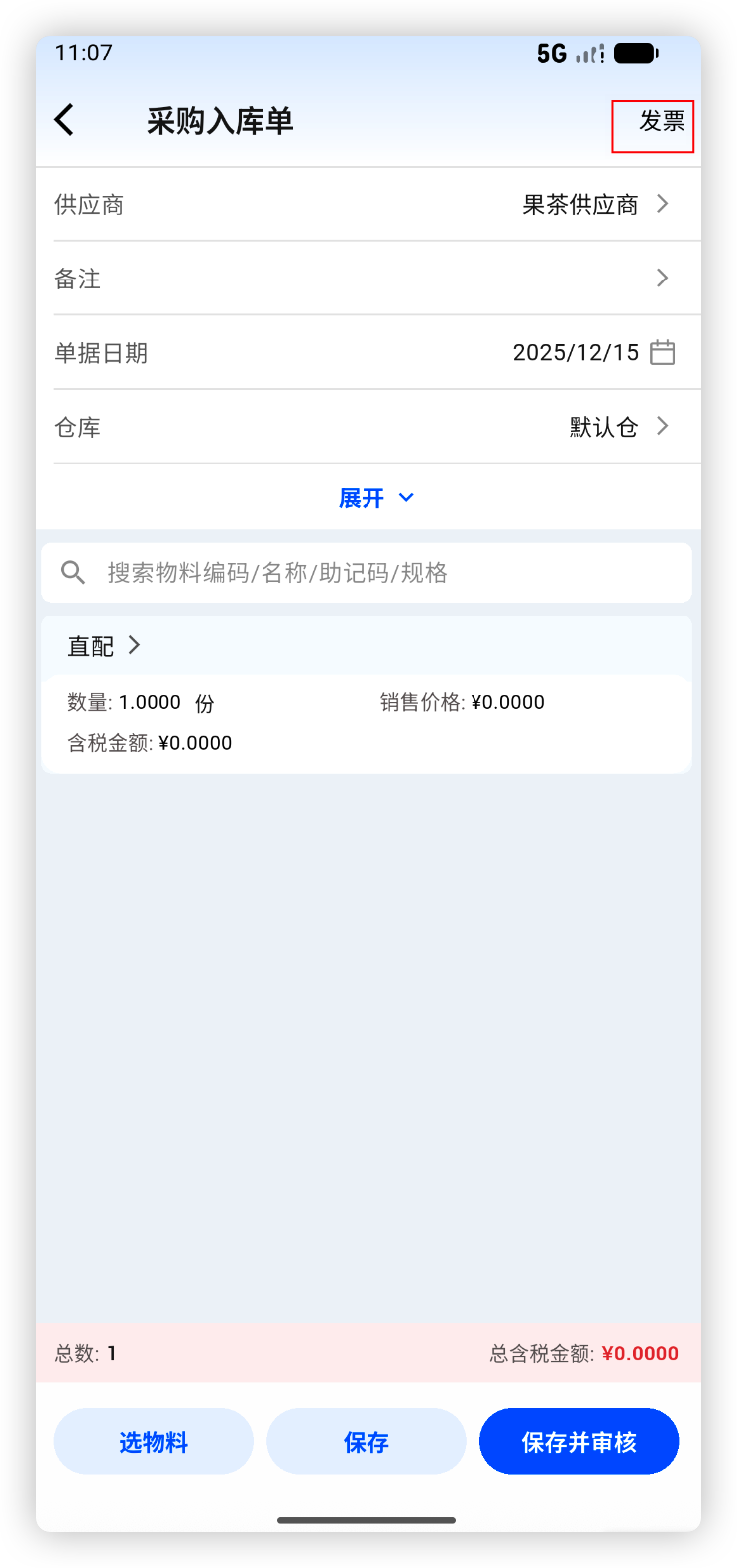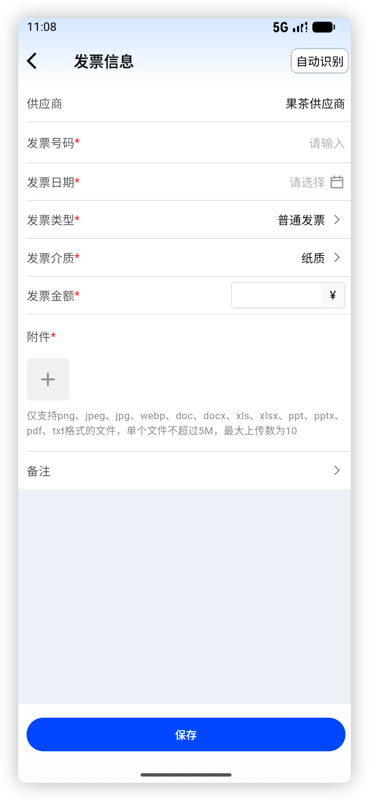 使用场景:供应商送货时连同发票一起,收货过程中将发票随单录入,或者拍照上传,系统自动识别发票号、发票日期、发票金额并自动填入