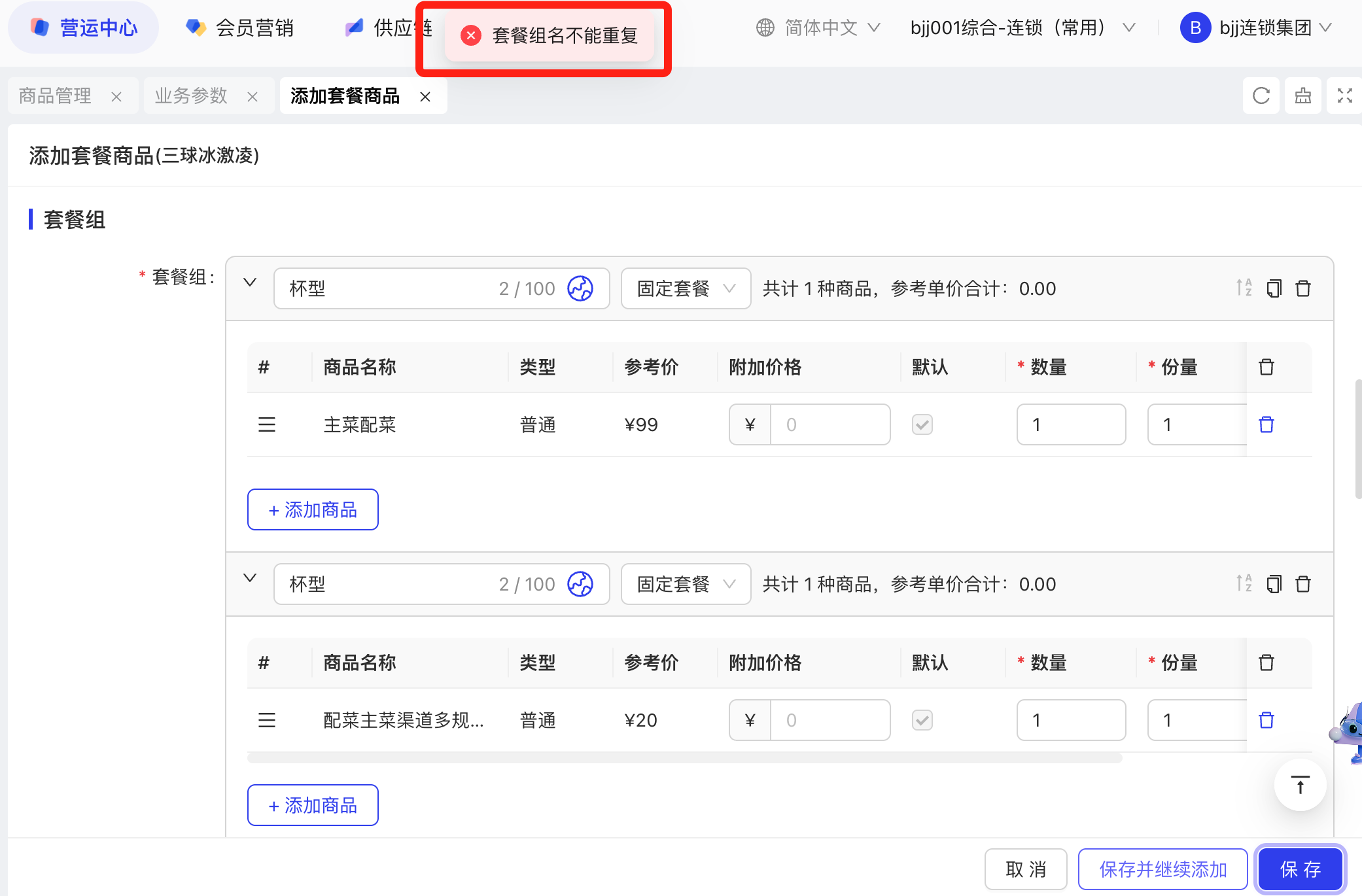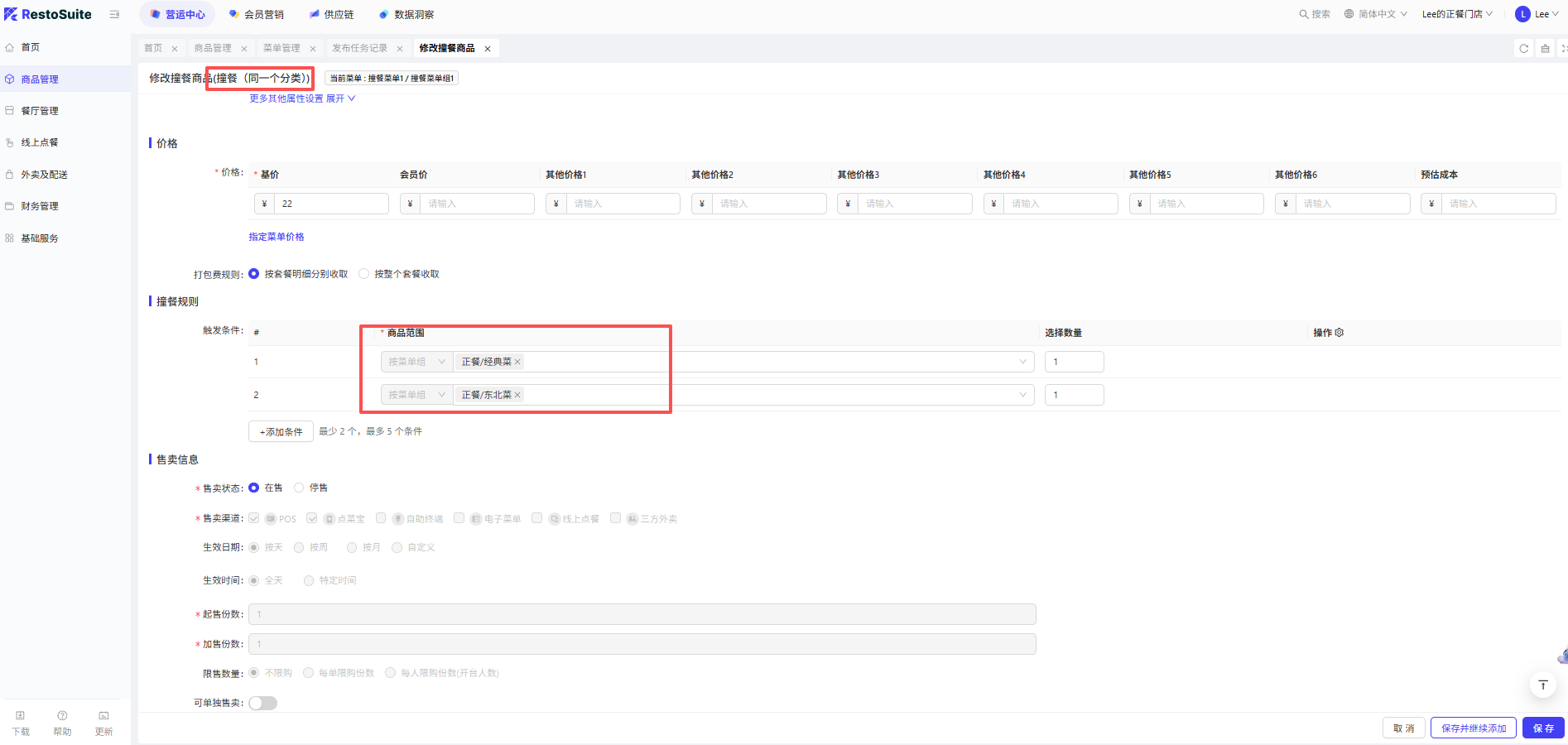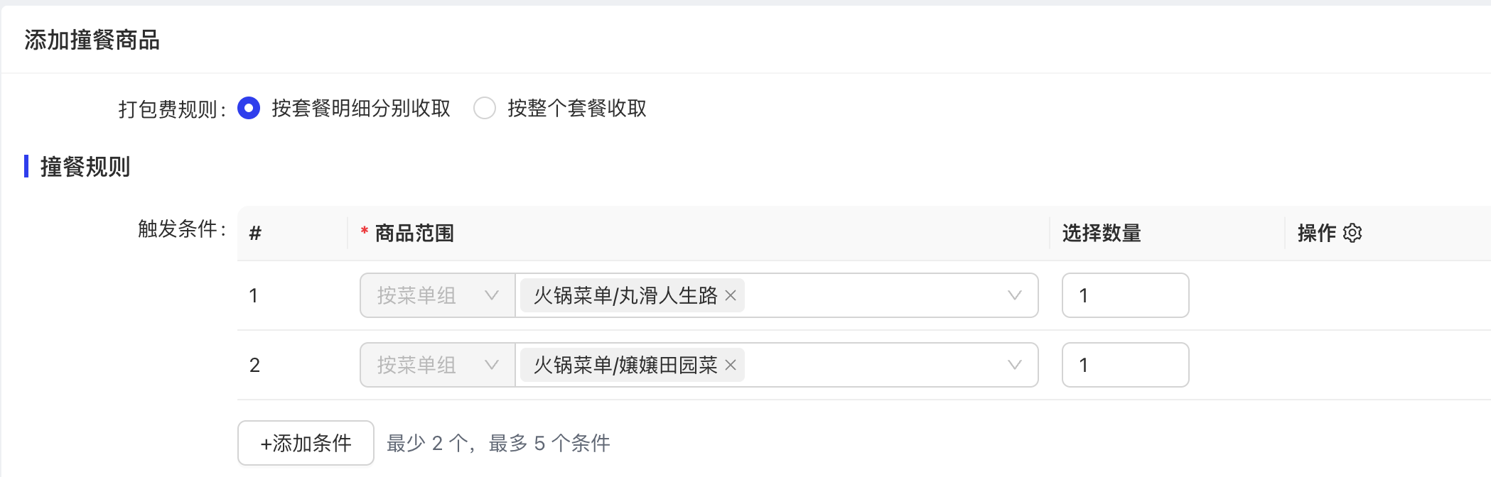 - 在 BO 的撞餐设置里,设置每个撞餐套餐包含的菜单组及菜品数量;