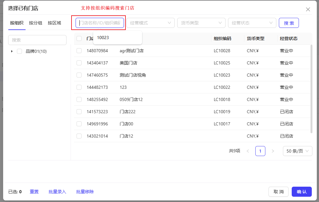 - 支持按组织编码搜索门店