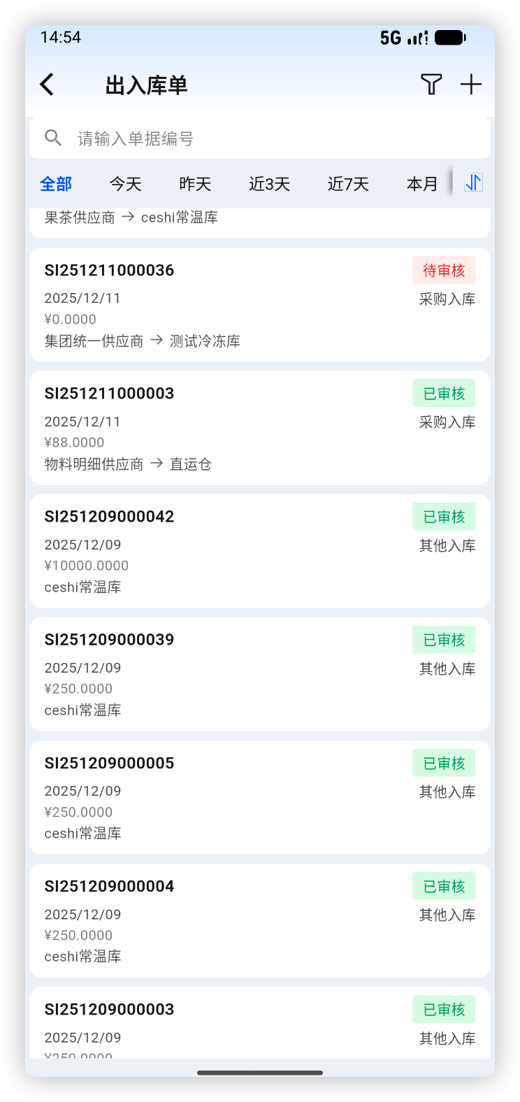 - 出入库单列表仅支持采购入库单新增及单据查看,其他业务单据后续支持