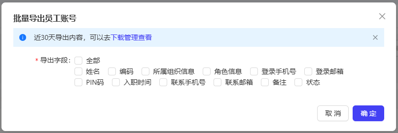 - 导出字段范围可选,目前支持导出员工基础档案和角色权限相关字段。