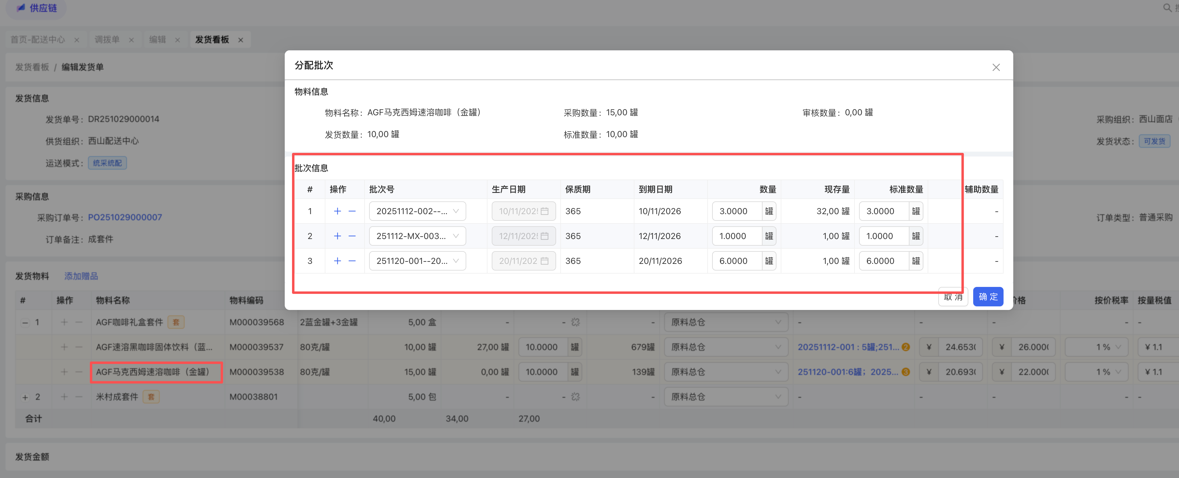 - 采购收货单:根据发货单带入的批次进行收货,修改母件数量的批次分配规则与发货单一致。