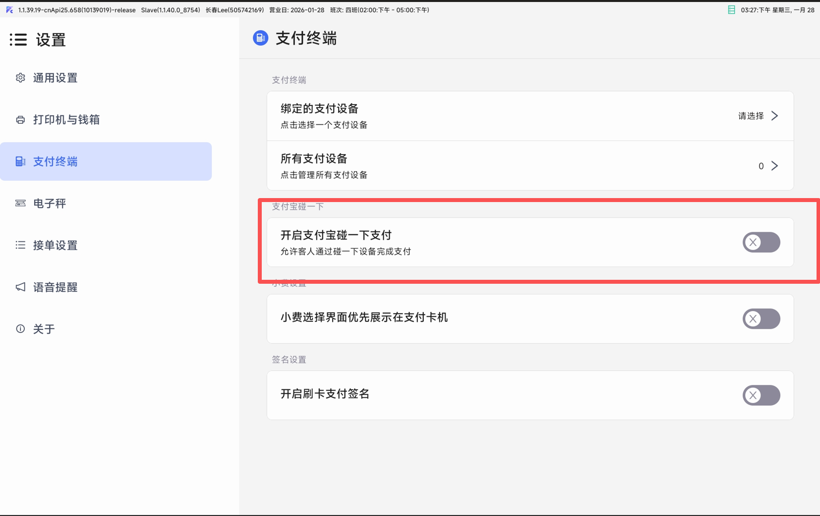 ### 1.2 安卓 POS-支持支付宝碰一碰设备支付及入会(v1.1.39.19、v1.1.40.9)