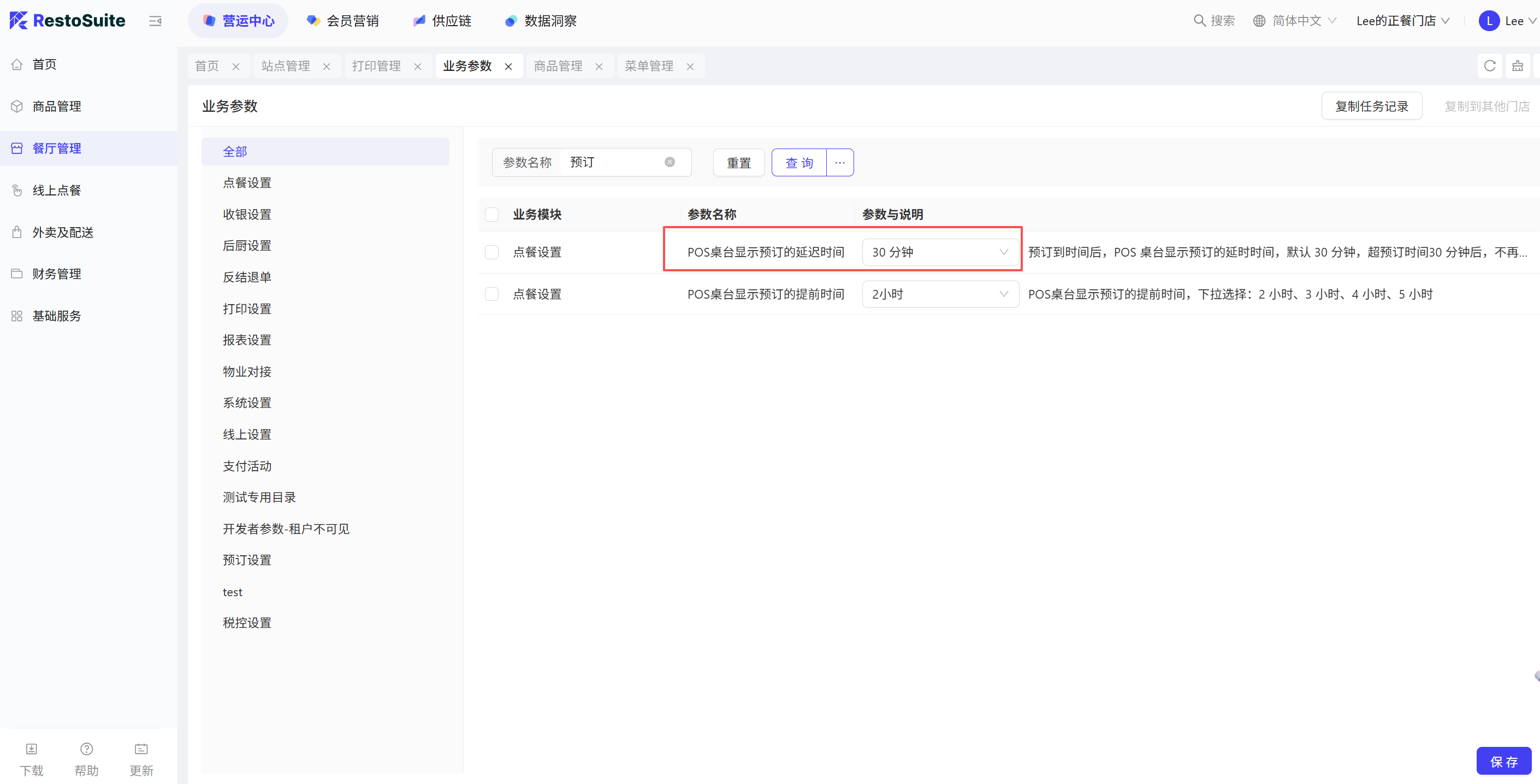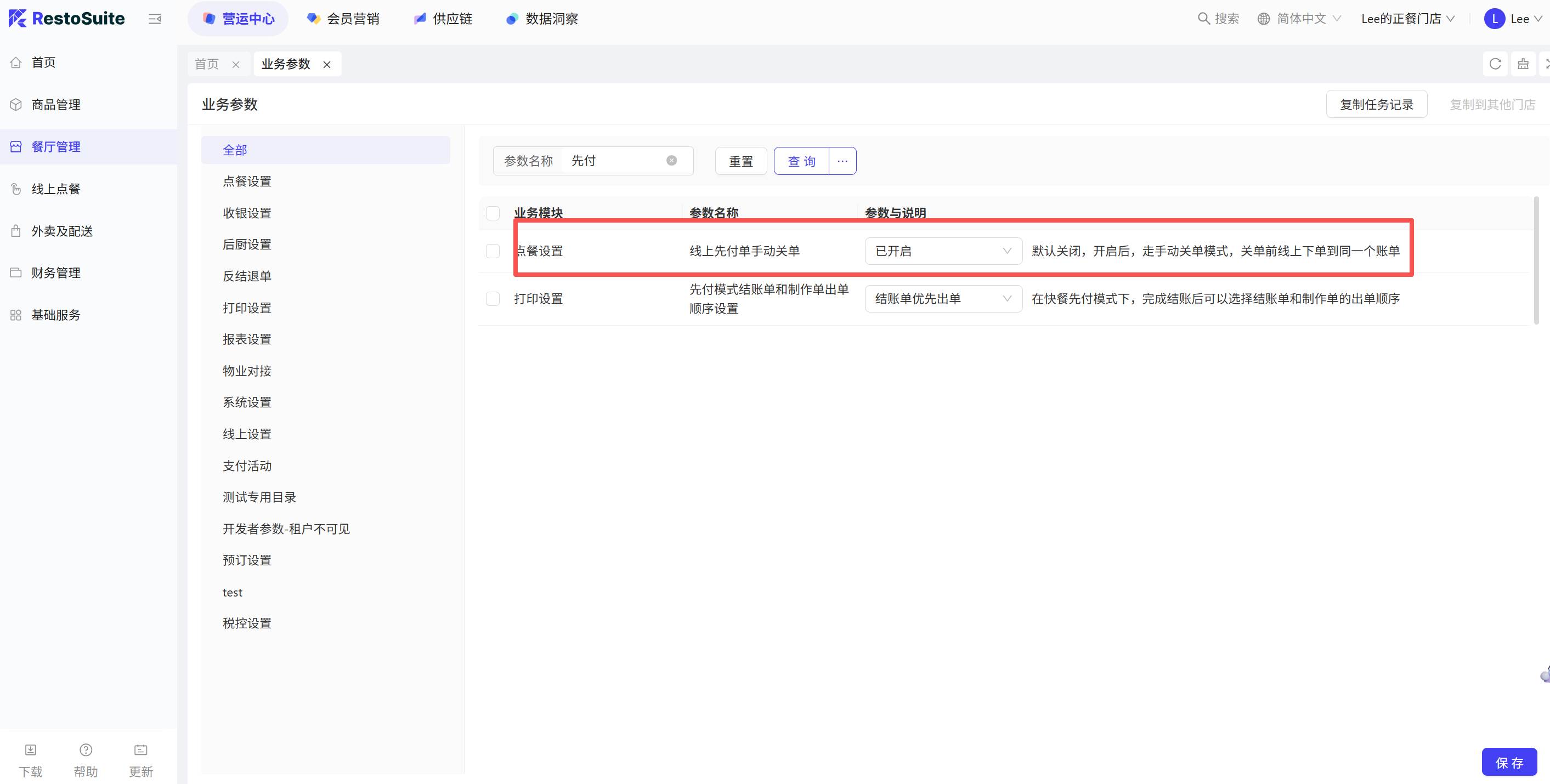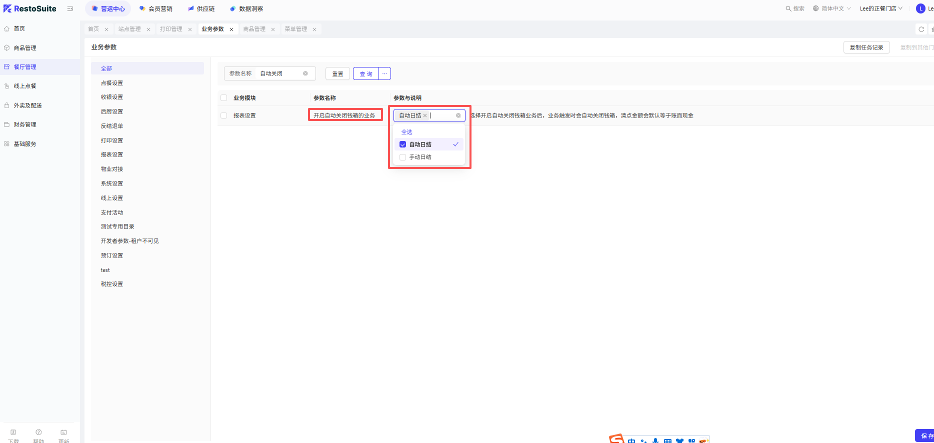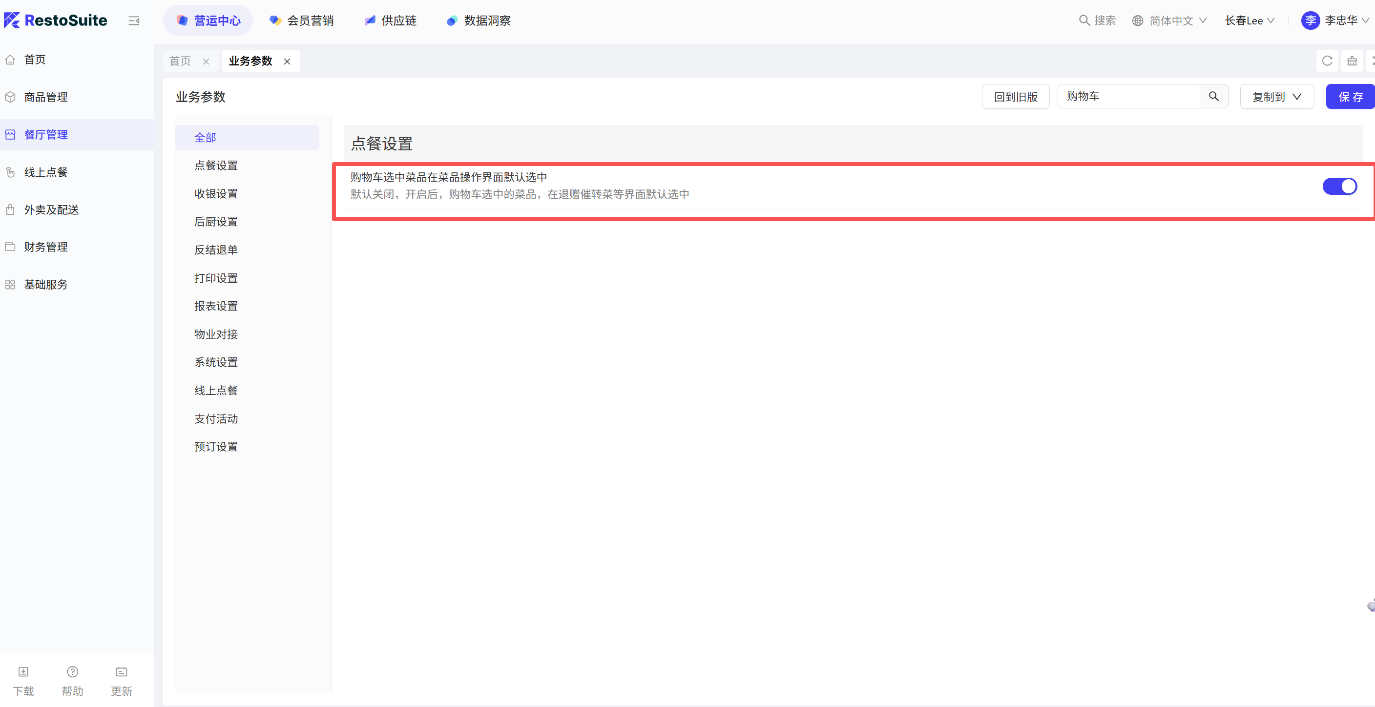 - 参数:购物车选中菜品在菜品操作界面默认选中 默认:关闭;