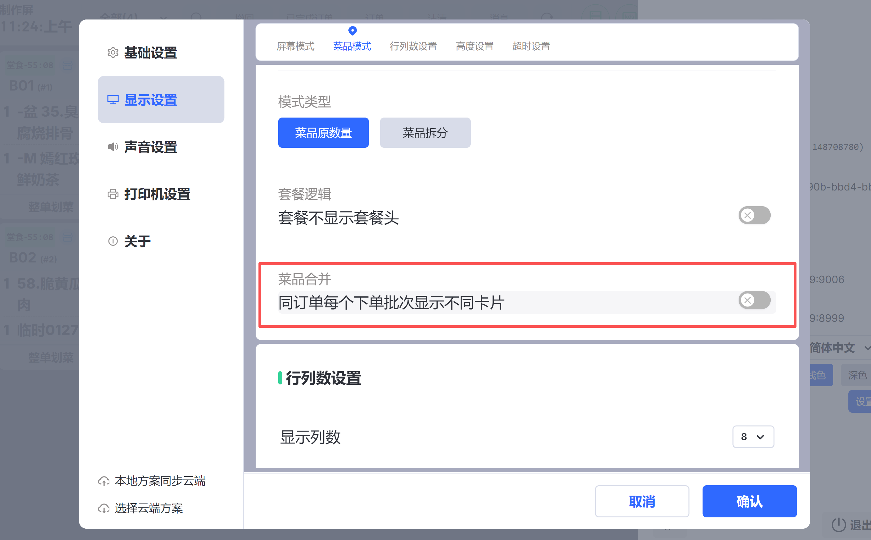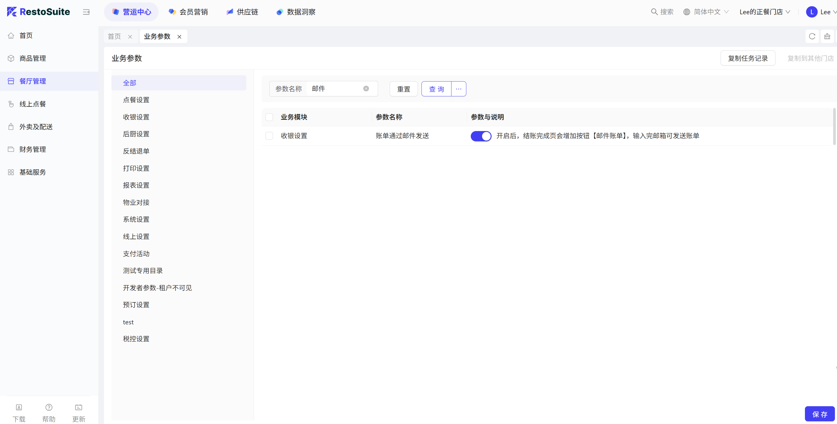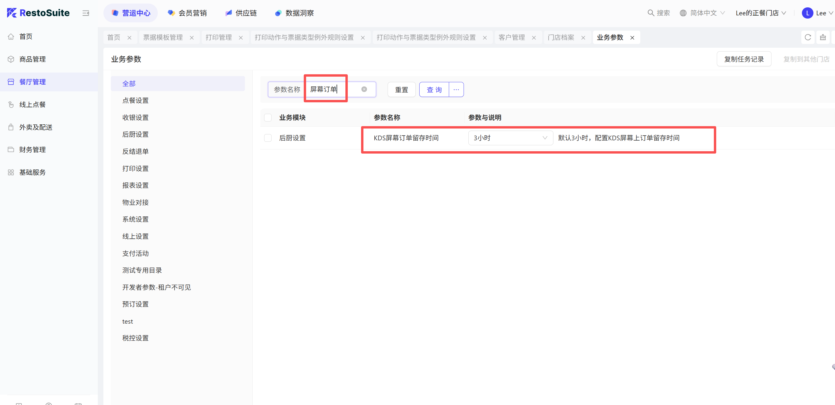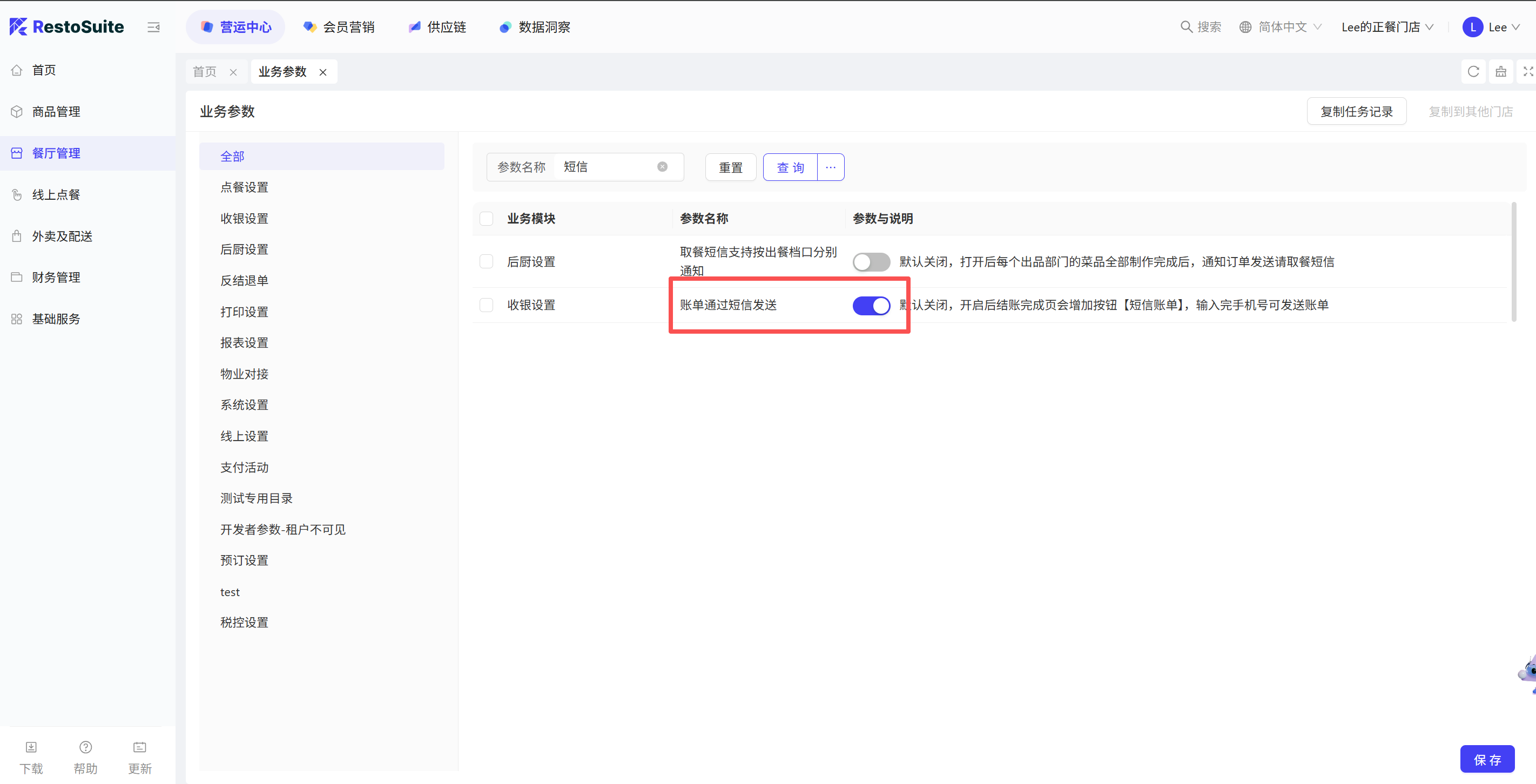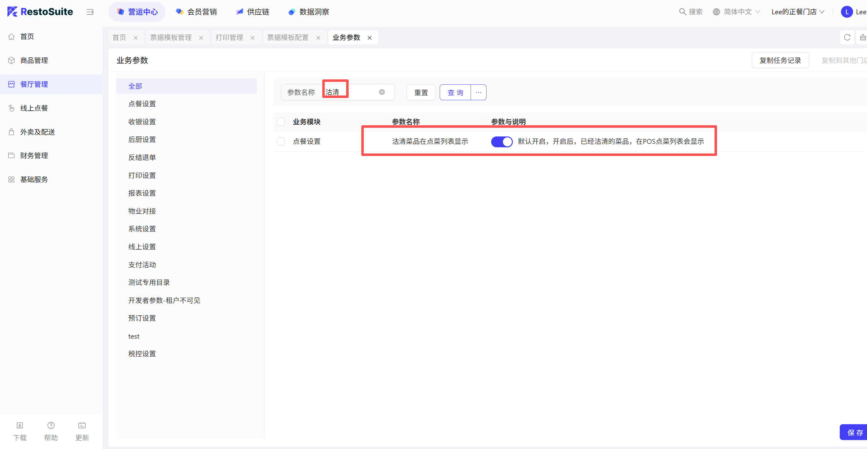 - 参数:购物车选中菜品在菜品操作界面默认选中 默认:关闭;