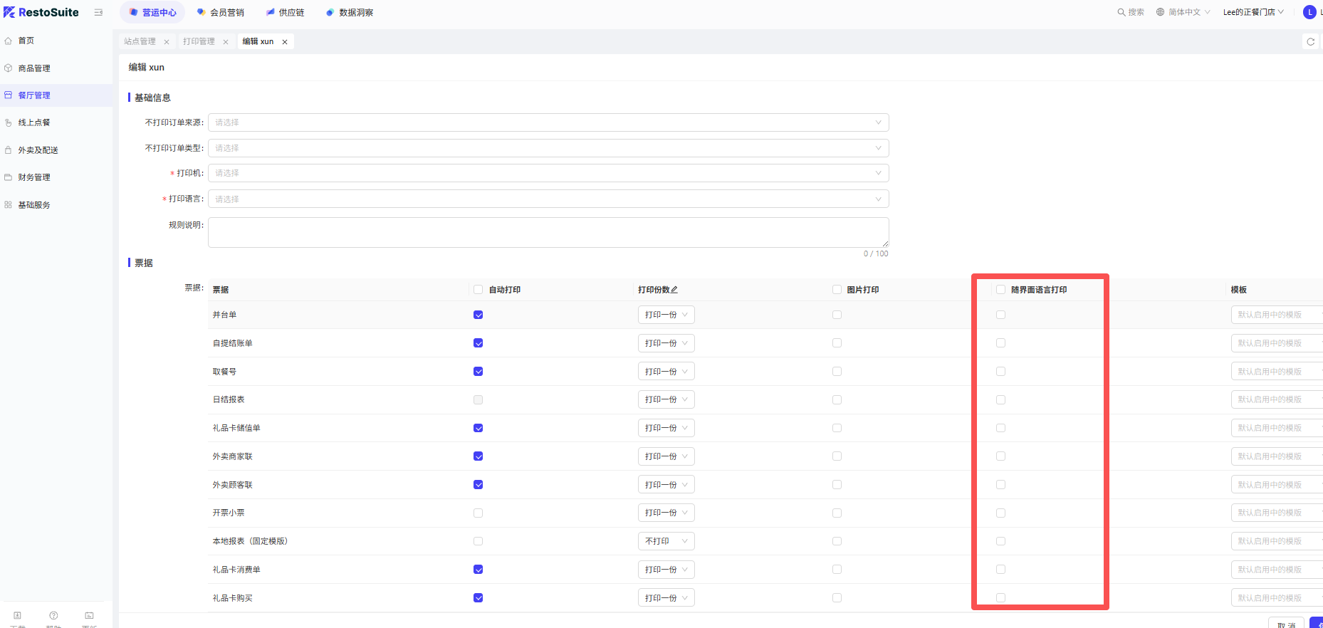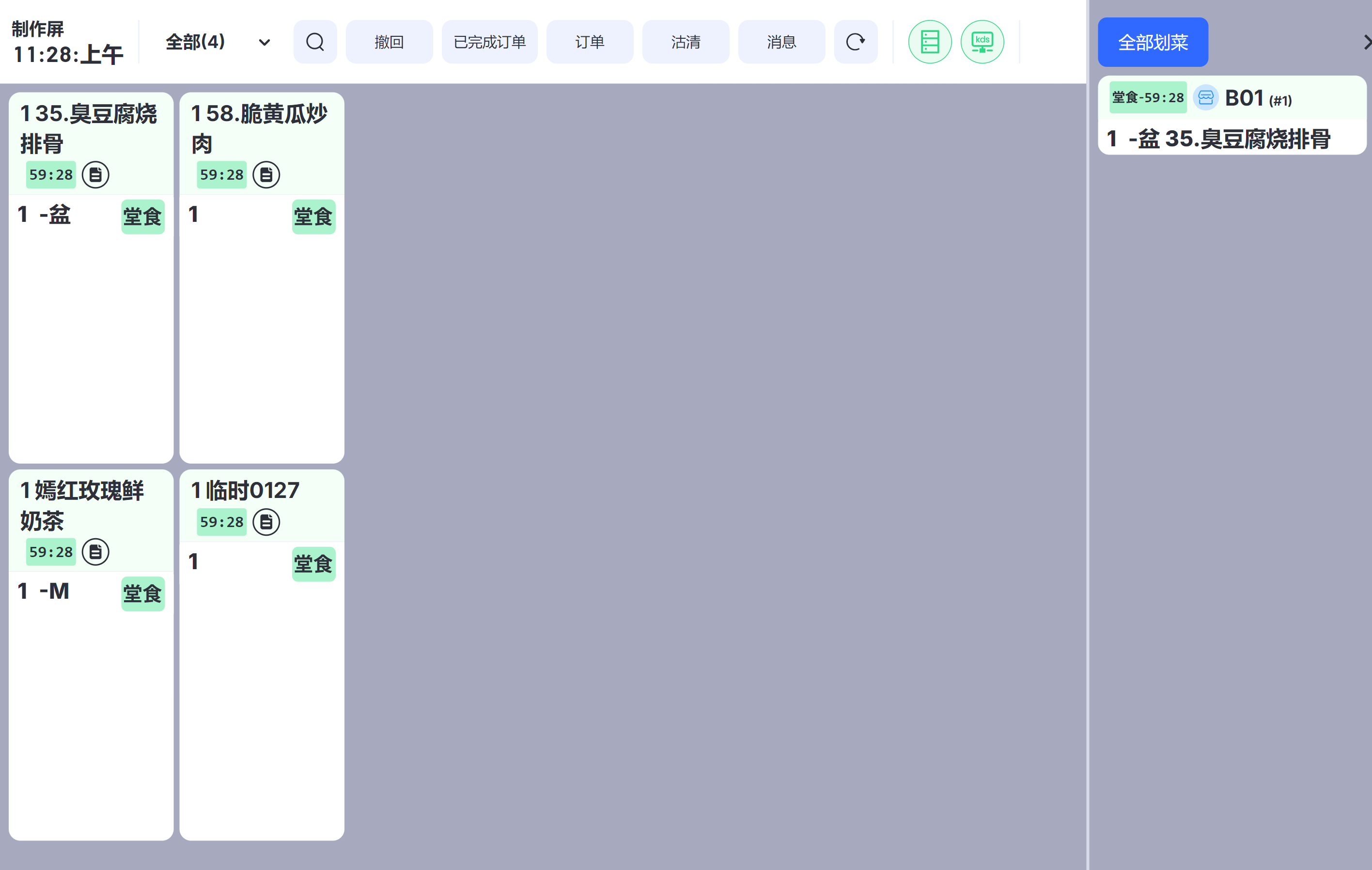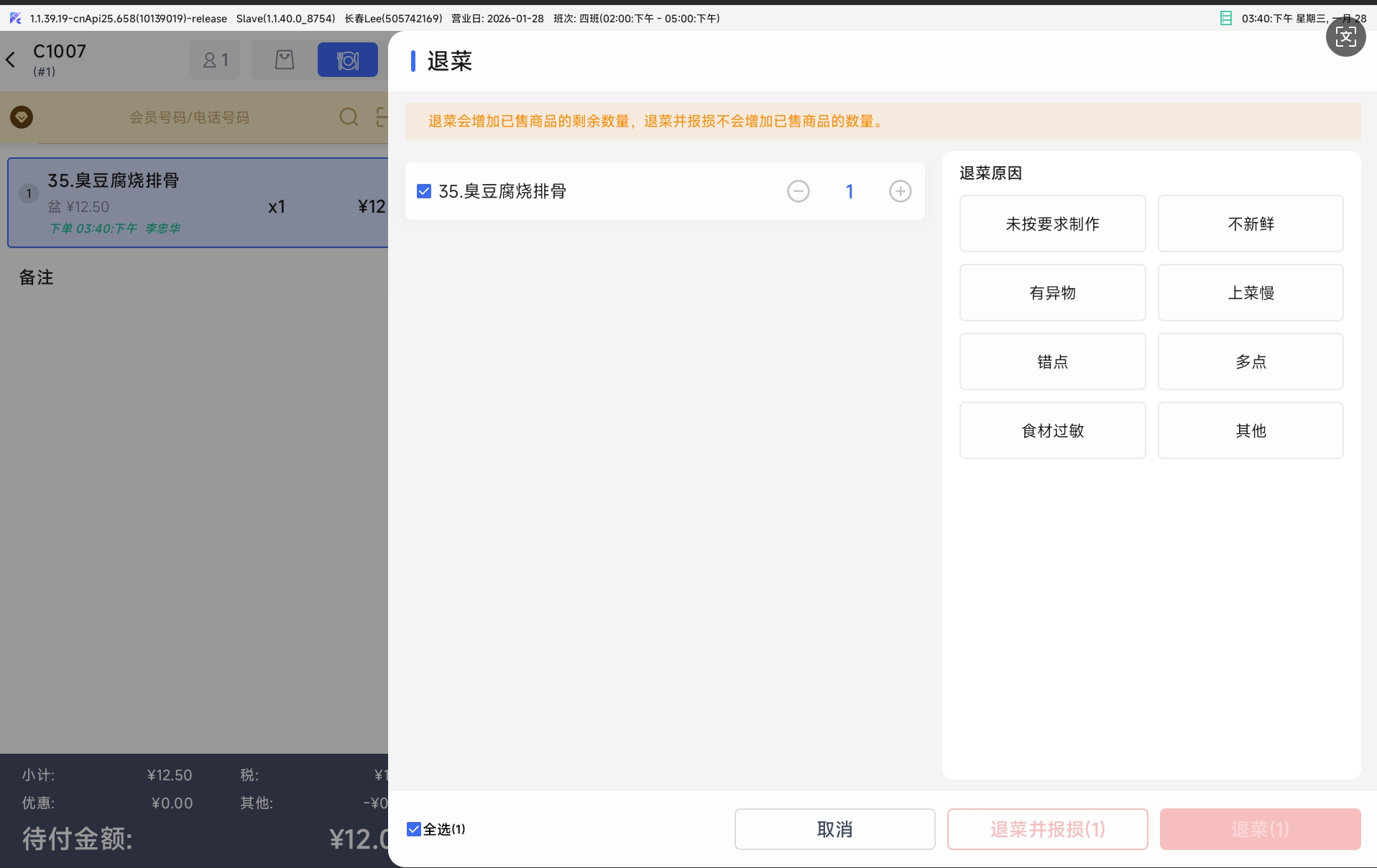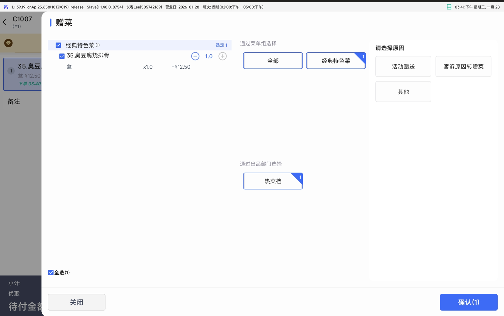 - 参数打开后,购物车选中的菜品,在退菜、赠菜、催菜、转菜界面默认选中;