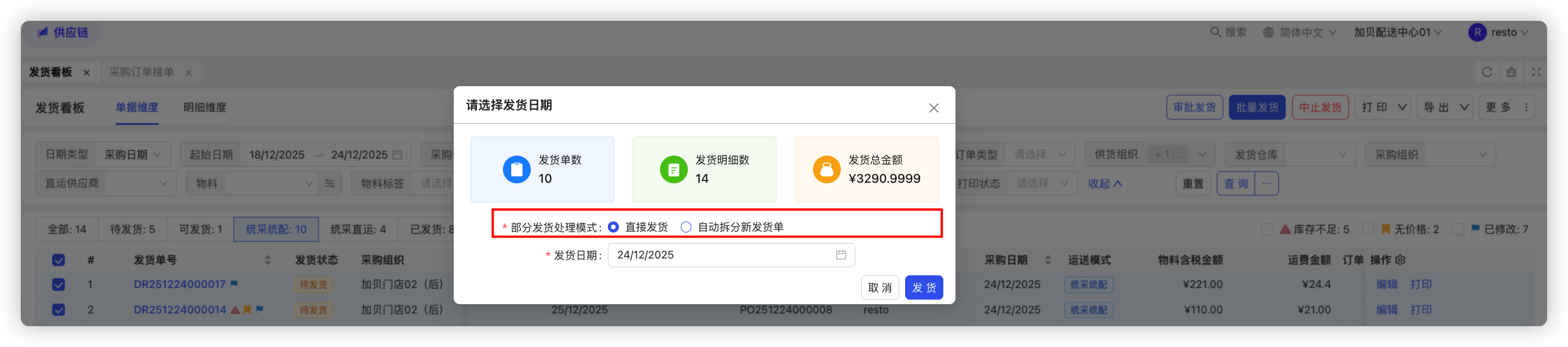- 发货看板单据维度批量发货新增部分发货处理模式:当发货单中存在未完全发货的物料,批量发货勾选处理模式,默认直接发货:按照发货数量直接发货;可手动选择自动拆分新发货单:将未发货的数量拆分成新的发货单