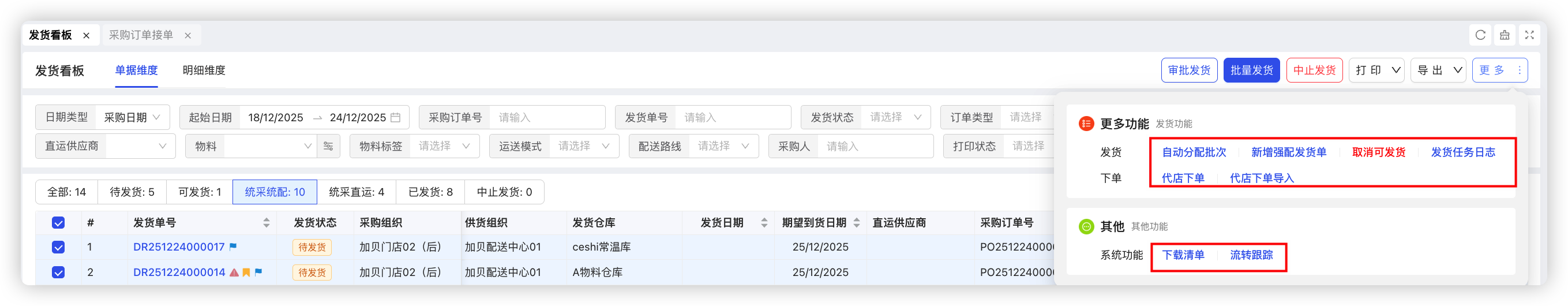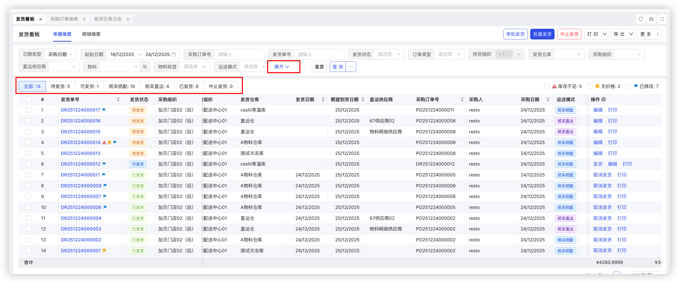 - 发货看板单据维度新增全部,代发货,可发货,已发货,中止发货,统采统配,统采直运等状态单据数量统计,筛选