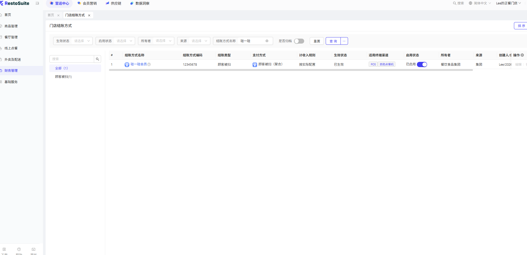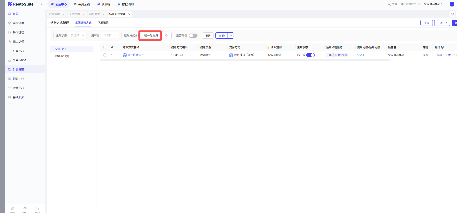 2. BO 增加系统级的支付方式:碰一碰会员,这个支付方式只使用在对接了碰一碰会员时使用;如果门店没有开启碰一碰会员功能时,使用原聚合支付的支付方式,只是通过碰一碰设备扫码支付;