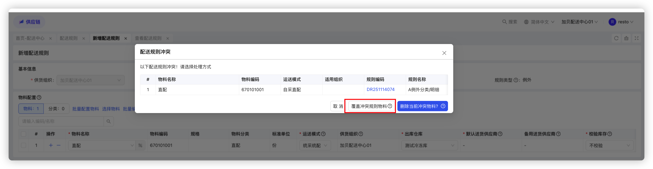 - 新增配送规则与已存在的配送规则冲突时,可以选择删除当前冲突物料和覆盖冲突物料两种模式