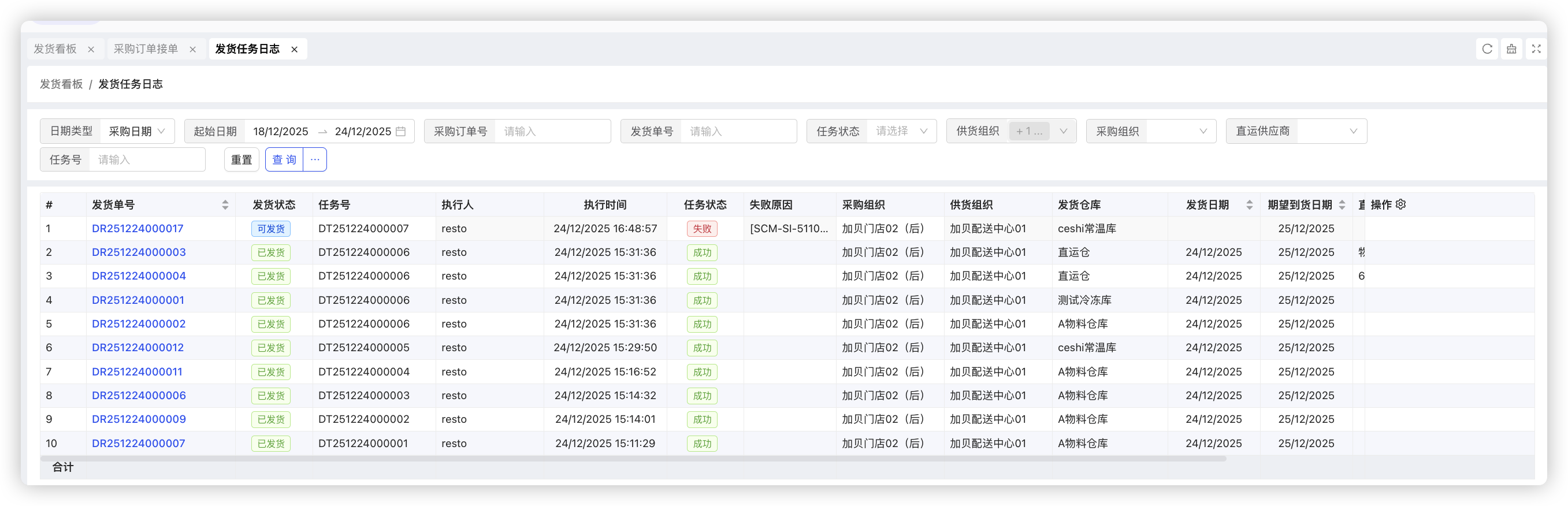 - 发货任务日志列表支持按日期,采购订单号,发货单号,任务状态,采购组织,直运供应商,任务号进行筛选