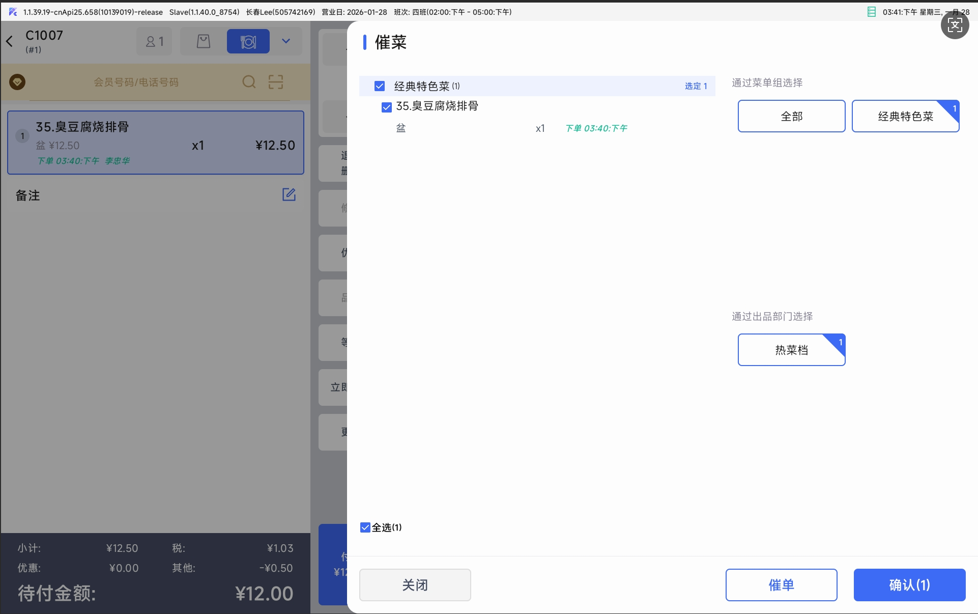 1.6 催菜、转菜界面根据参数不默认带入选中的菜品