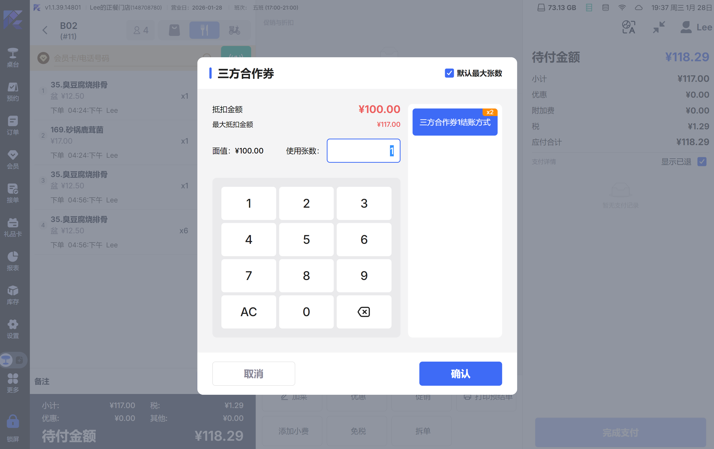 - 根据参数,核券窗口显示1张还是可以核销的最大张数;