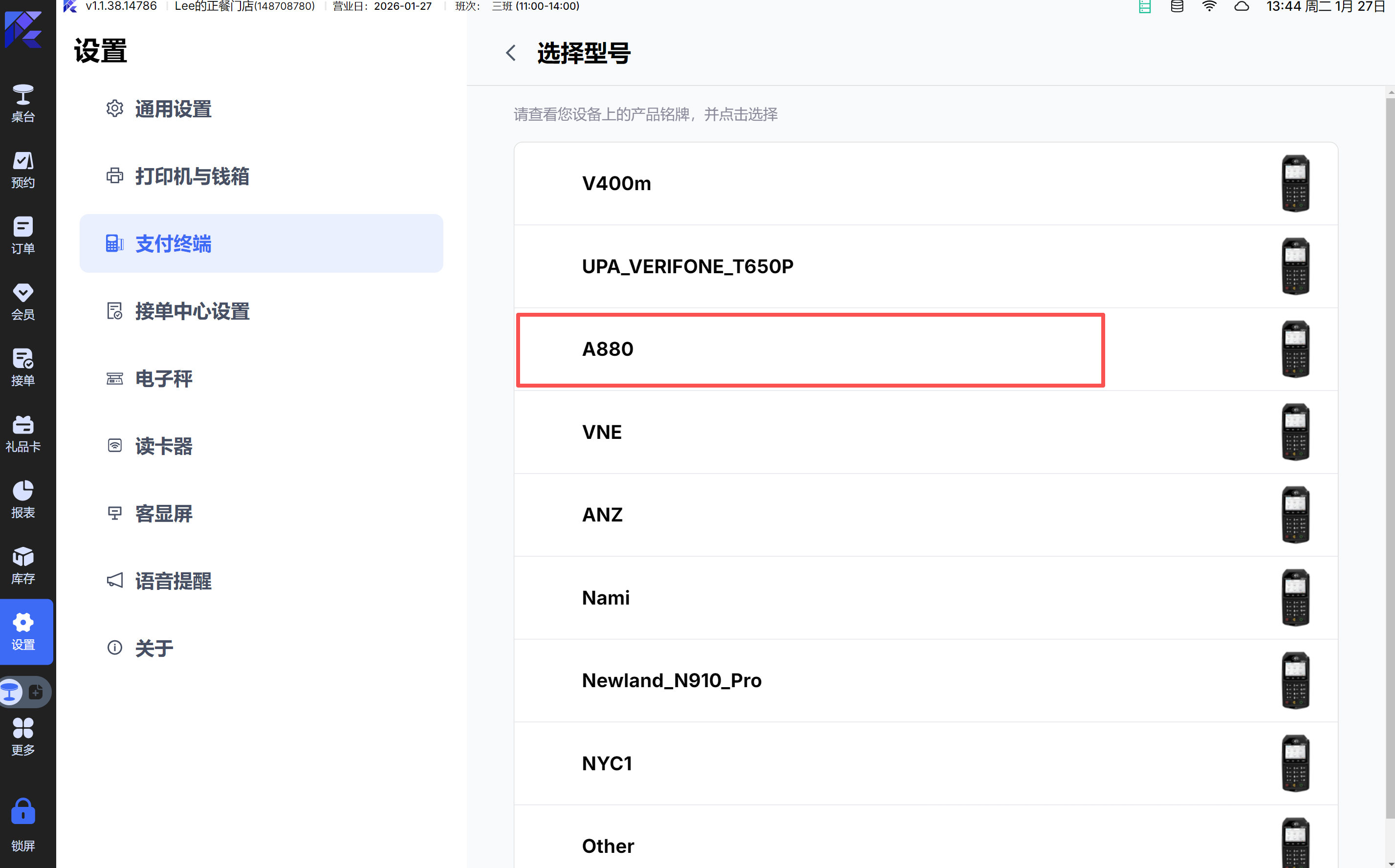 - win-pos支付终端支持选择A880卡机,选择对应的COM口;